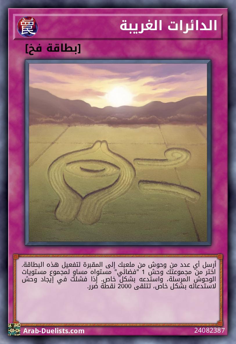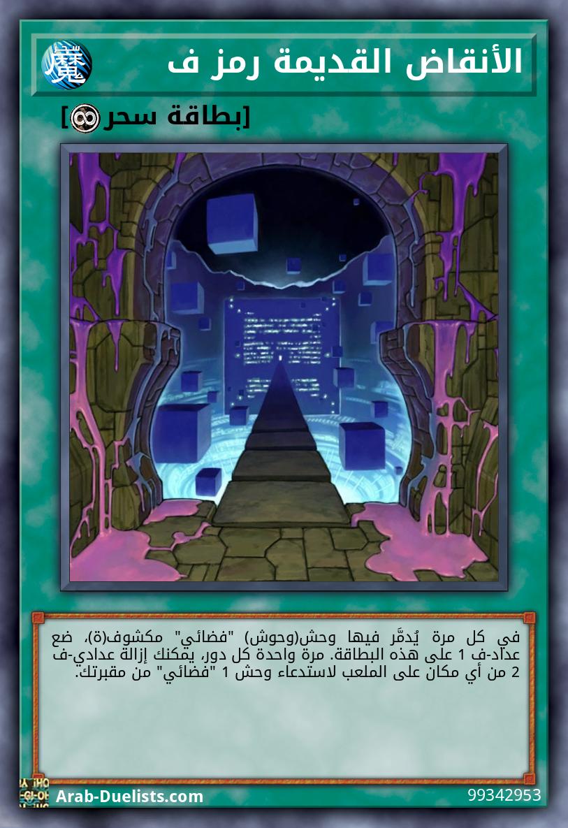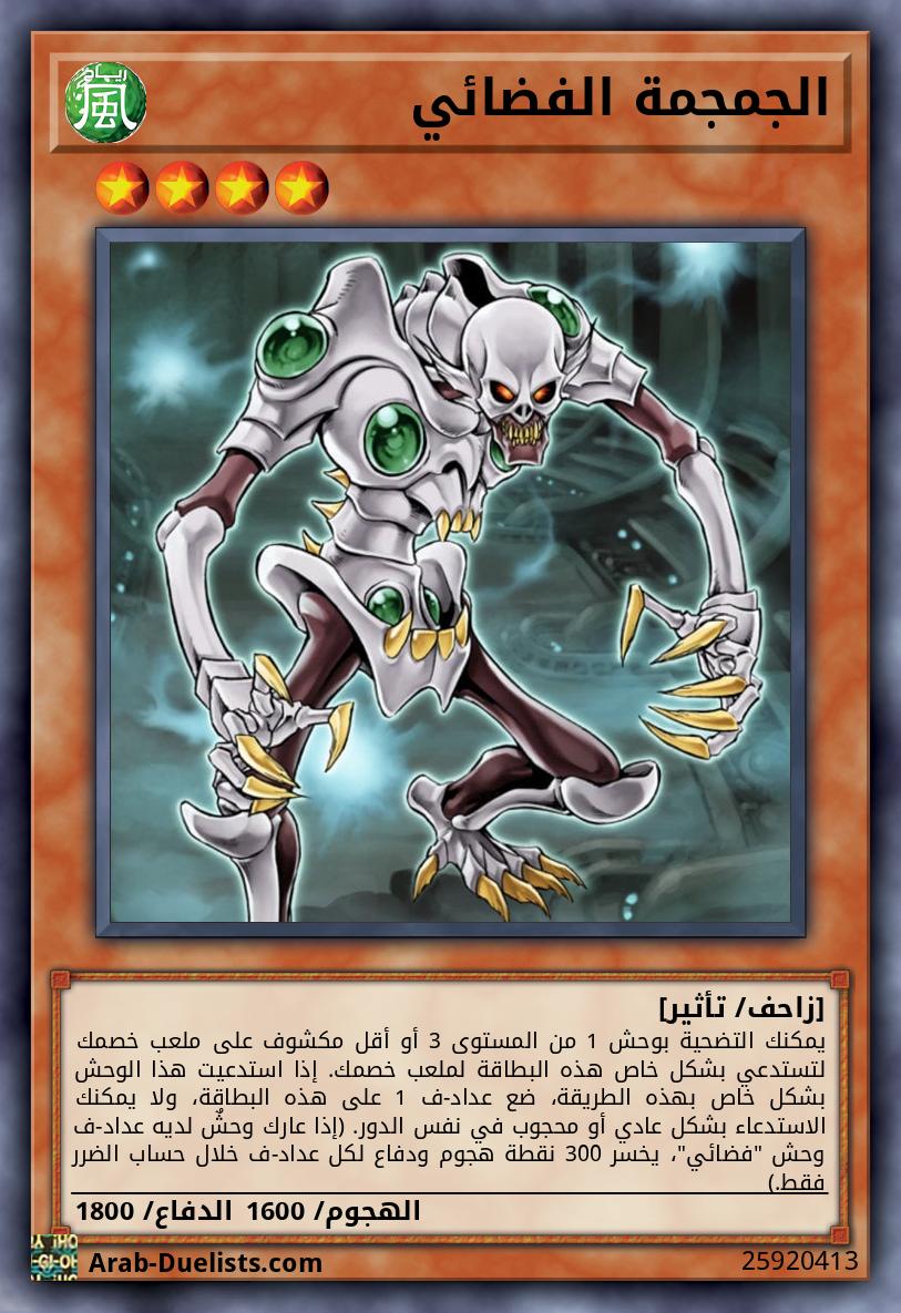 في كل مرة يُدمَّر فيها وحش(وحوش) "فضائي" مكشوف(ة)، ضع عداد-ف 1 على هذه البطاقة. مرة واحدة كل دور، يمكنك إزالة عدادي-ف 2 من أي مكان على الملعب لاستدعاء وحش 1 "فضائي" من مقبرتك.