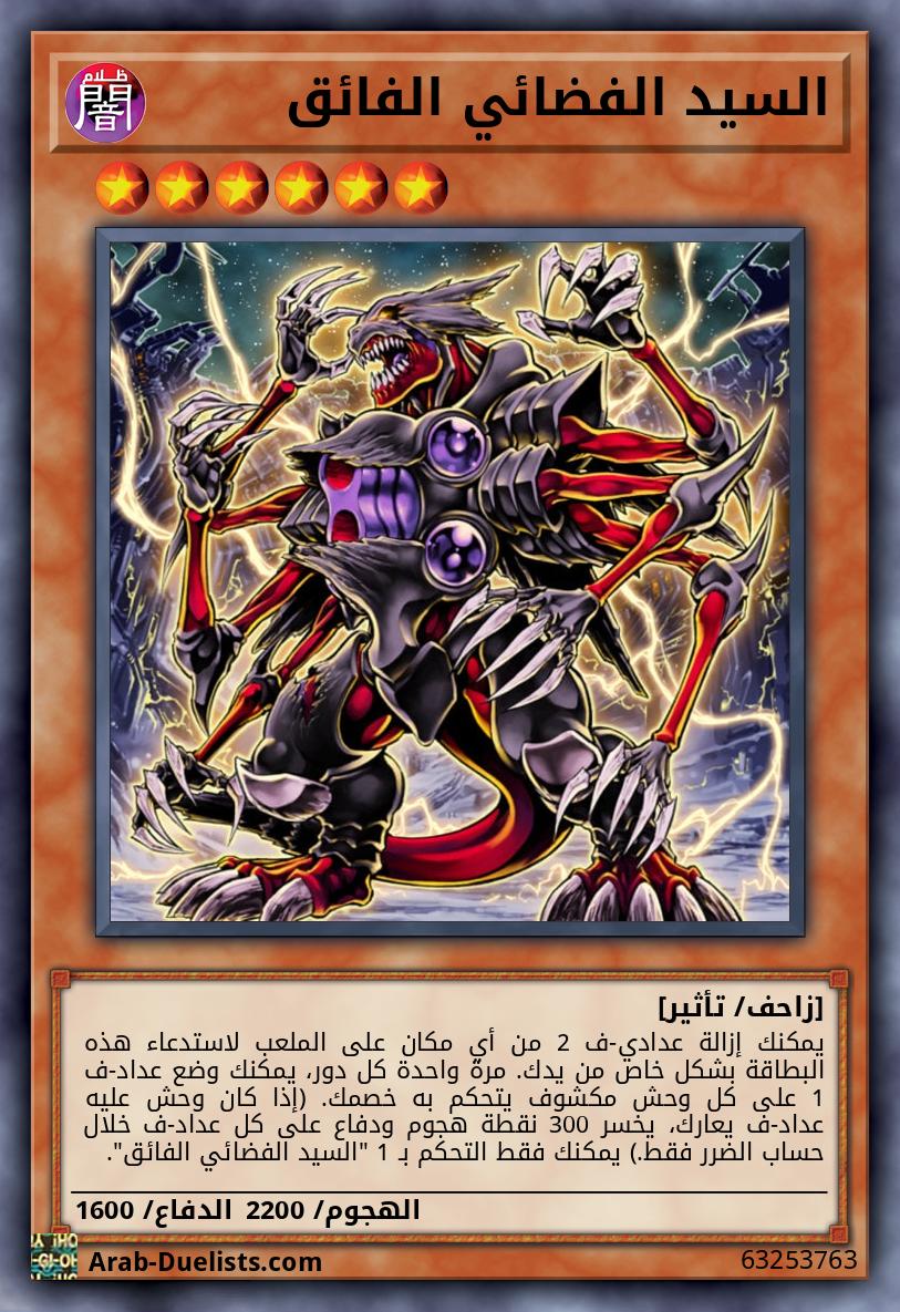 يمكنك إزالة عدادي-ف 2 من أي مكان على الملعب لاستدعاء هذه البطاقة بشكل خاص من يدك. مرة واحدة كل دور، يمكنك وضع عداد-ف 1 على كل وحش مكشوف يتحكم به خصمك. (إذا كان وحش عليه عداد-ف يعارك، يخسر 300 نقطة هجوم ودفاع على كل عداد-ف خلال حساب الضرر فقط.) يمكنك فقط التحكم بـ 1 "السيد الفضائي الفائق".