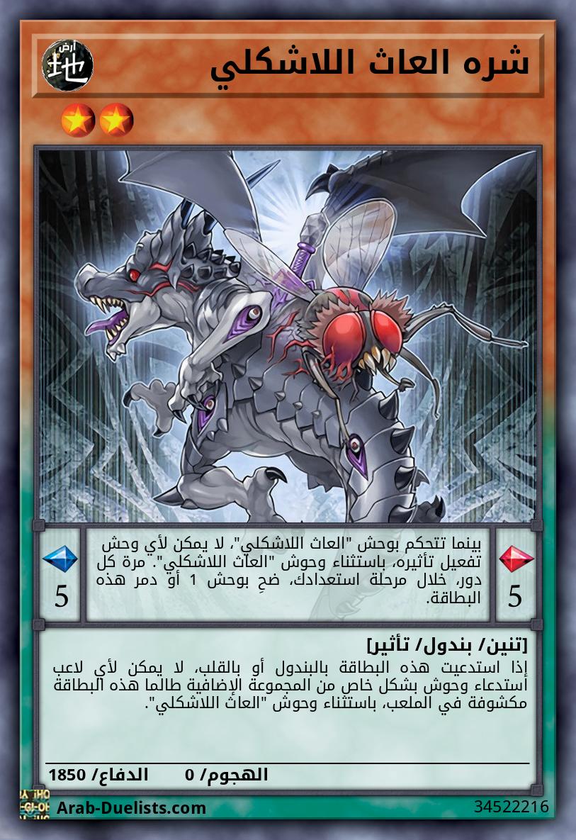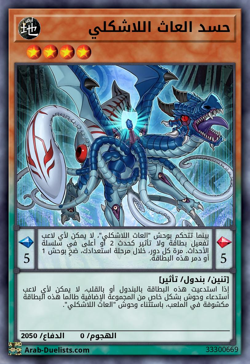 تكسب كل وحوش "العاث اللاشكلي" على الملعب 100 نقطة هجوم ودفاع لكل بطاقة "العاث اللاشكلي " في الملعب. إذا ضُحيِ بوحش(وحوش) في يدك أو الملعب، أو دُمِّر بالمعركة أو بتأثير بطاقة: يمكنك إضافة بطاقة 1 "العاث اللاشكلي" من مجموعتك إلى يدك. يمكنك فقط استخدام هذا التأثير لـ "عدوى العاث اللاشكلي" مرة واحدة كل دور.