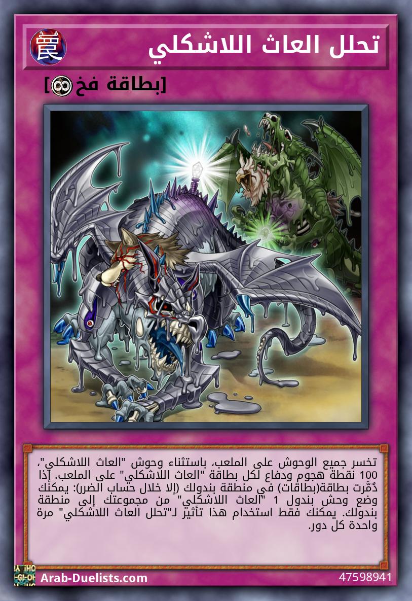 تخسر جميع الوحوش على الملعب، باستثناء وحوش "العاث اللاشكلي"، 100 نقطة هجوم ودفاع لكل بطاقة "العاث اللاشكلي" على الملعب. إذا دٌمَّرت بطاقة(بطاقات) في منطقة بندولك (إلا خلال حساب الضرر): يمكنك وضع وحش بندول 1 "العاث اللاشكلي" من مجموعتك إلى منطقة بندولك. يمكنك فقط استخدام هذا تأثير لـ"تحلل العاث اللاشكلي" مرة واحدة كل دور.