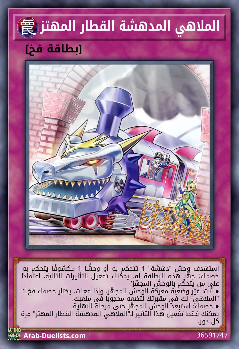 استهدف وحش "دهشة" 1 تتحكم به أو وحشًا 1 مكشوفًا يتحكم به خصمك؛ جهّز هذه البطاقة له. يمكنك تفعيل التأثيرات التالية، اعتمادًا على من يتحكم بالوحش المجهّز؛ ● أنت: غيّر وضعية معركة الوحش المجهّز، وإذا فعلت، يختار خصمك فخ 1 "الملاهي" لك في مقبرتك لتضعه محجوبا في ملعبك. ● خصمك: استبعد الوحش المجهّز حتى مرحلة النهاية. يمكنك فقط تفعيل هذا التأثير لـ"الملاهي المدهشة القطار المهتز" مرة كل دور.
