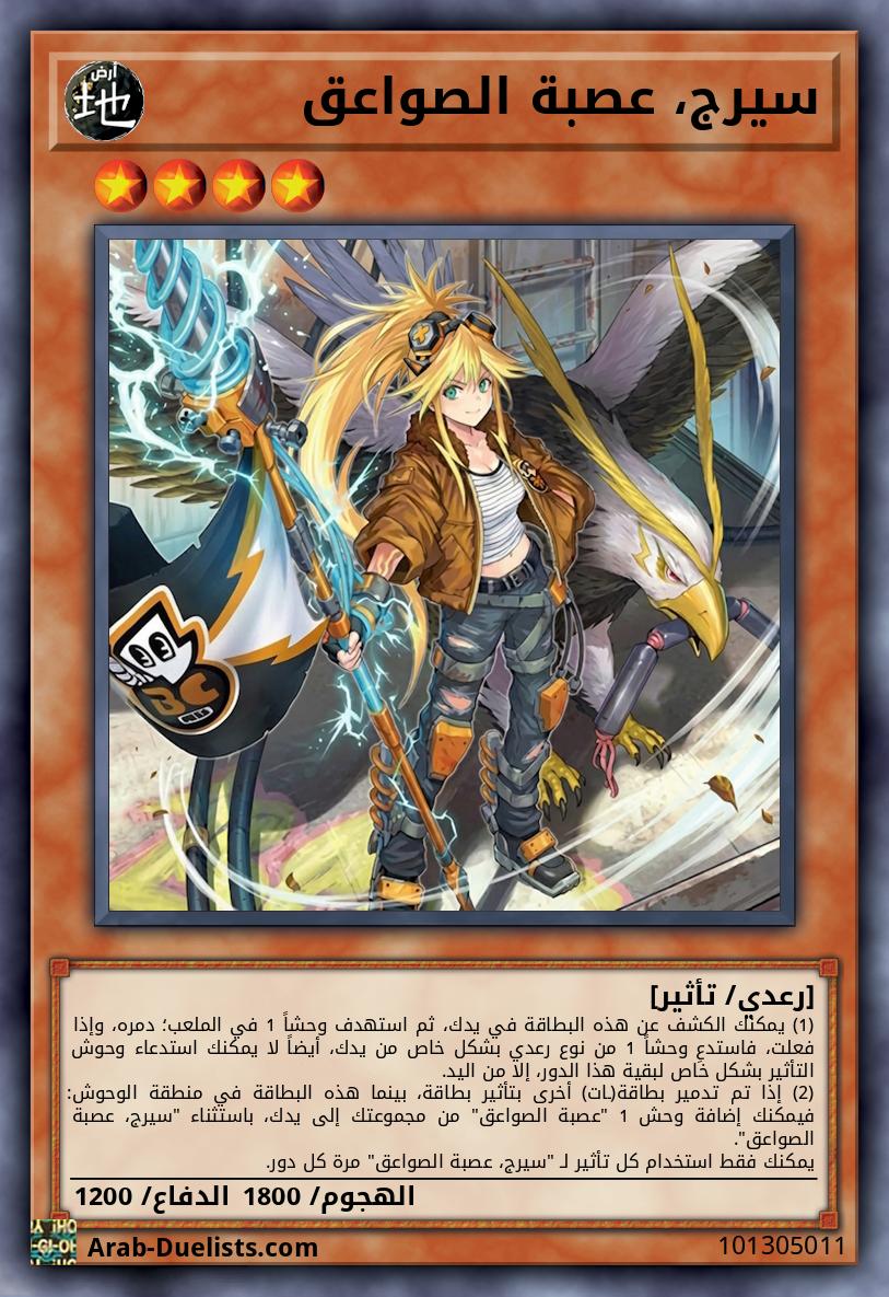 (1) يمكنك الكشف عن هذه البطاقة في يدك، ثم استهدف وحشاً 1 في الملعب؛ دمره، وإذا فعلت، فاستدعِ وحشاً 1 من نوع رعدي بشكل خاص من يدك، أيضاً لا يمكنك استدعاء وحوش التأثير بشكل خاص لبقية هذا الدور، إلا من اليد. (2) إذا تم تدمير بطاقة(ـات) أخرى بتأثير بطاقة، بينما هذه البطاقة في منطقة الوحوش: فيمكنك إضافة وحش 1 "عصبة الصواعق" من مجموعتك إلى يدك، باستثناء "سيرج، عصبة الصواعق". يمكنك فقط استخدام كل تأثير لـ "سيرج، عصبة الصواعق" مرة كل دور.