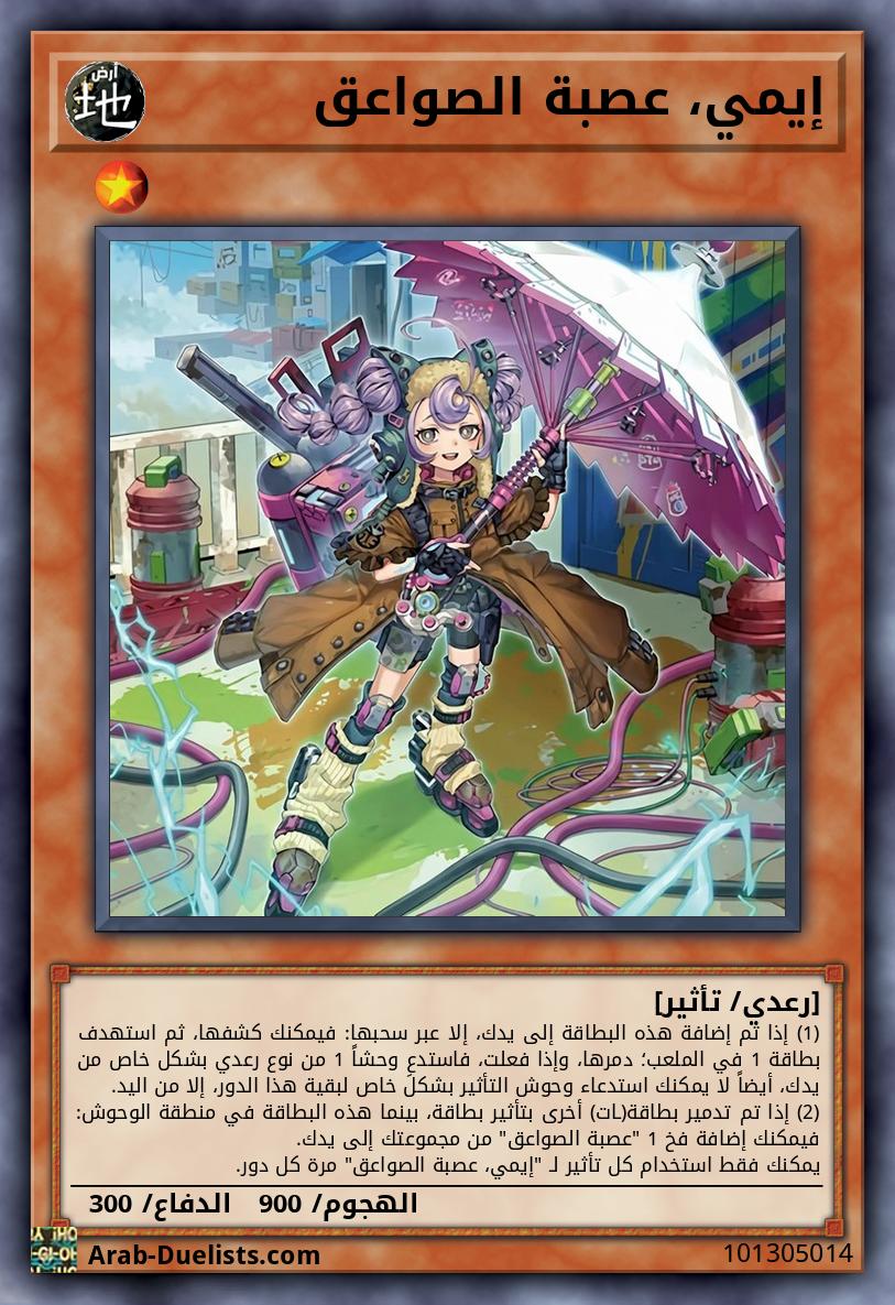 (1) إذا تم إضافة هذه البطاقة إلى يدك، إلا عبر سحبها: فيمكنك كشفها، ثم استهدف بطاقة 1 في الملعب؛ دمرها، وإذا فعلت، فاستدعِ وحشاً 1 من نوع رعدي بشكل خاص من يدك، أيضاً لا يمكنك استدعاء وحوش التأثير بشكل خاص لبقية هذا الدور، إلا من اليد. (2) إذا تم تدمير بطاقة(ـات) أخرى بتأثير بطاقة، بينما هذه البطاقة في منطقة الوحوش: فيمكنك إضافة فخ 1 "عصبة الصواعق" من مجموعتك إلى يدك. يمكنك فقط استخدام كل تأثير لـ "إيمي، عصبة الصواعق" مرة كل دور.