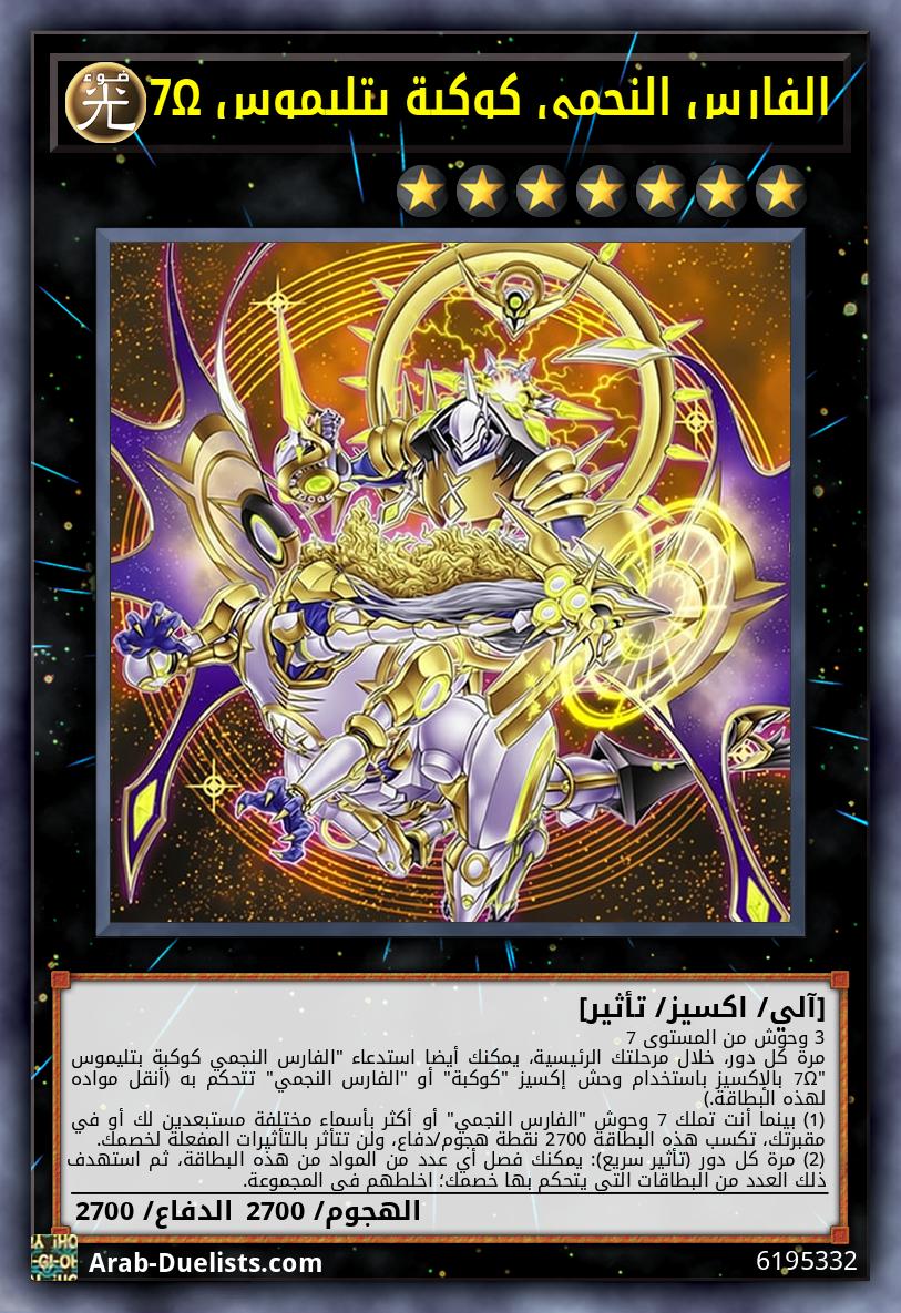 3 وحوش من المستوى 7 مرة كل دور، خلال مرحلتك الرئيسية، يمكنك أيضا استدعاء "الفارس النجمي كوكبة بتليموس 7Ω" بالإكسيز باستخدام وحش إكسيز "كوكبة" أو "الفارس النجمي" تتحكم به (أنقل مواده لهذه البطاقة.) (1) بينما أنت تملك 7 وحوش "الفارس النجمي" أو أكثر بأسماء مختلفة مستبعدين لك أو في مقبرتك، تكسب هذه البطاقة 2700 نقطة هجوم/دفاع، ولن تتأثر بالتأثيرات المفعلة لخصمك. (2) مرة كل دور (تأثير سريع): يمكنك فصل أي عدد من المواد من هذه البطاقة، ثم استهدف ذلك العدد من البطاقات التي يتحكم بها خصمك؛ اخلطهم في المجموعة.