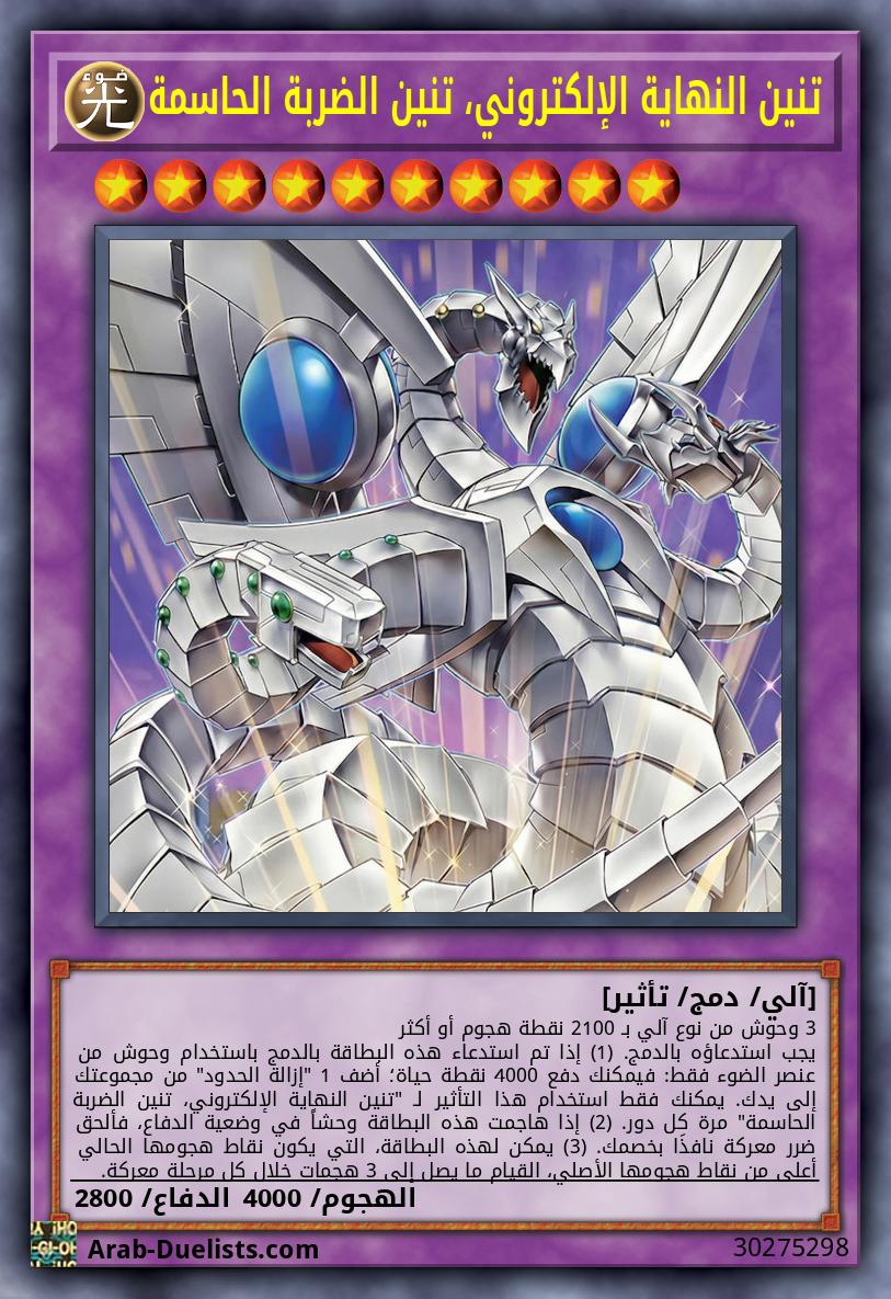 3 وحوش من نوع آلي بـ 2100 نقطة هجوم أو أكثر يجب استدعاؤه بالدمج. (1) إذا تم استدعاء هذه البطاقة بالدمج باستخدام وحوش من عنصر الضوء فقط: فيمكنك دفع 4000 نقطة حياة؛ أضف 1 "إزالة الحدود" من مجموعتك إلى يدك. يمكنك فقط استخدام هذا التأثير لـ "تنين النهاية الإلكتروني، تنين الضربة الحاسمة" مرة كل دور. (2) إذا هاجمت هذه البطاقة وحشاً في وضعية الدفاع، فألحق ضرر معركة نافذَا بخصمك. (3) يمكن لهذه البطاقة، التي يكون نقاط هجومها الحالي أعلى من نقاط هجومها الأصلي، القيام ما يصل إلى 3 هجمات خلال كل مرحلة معركة.