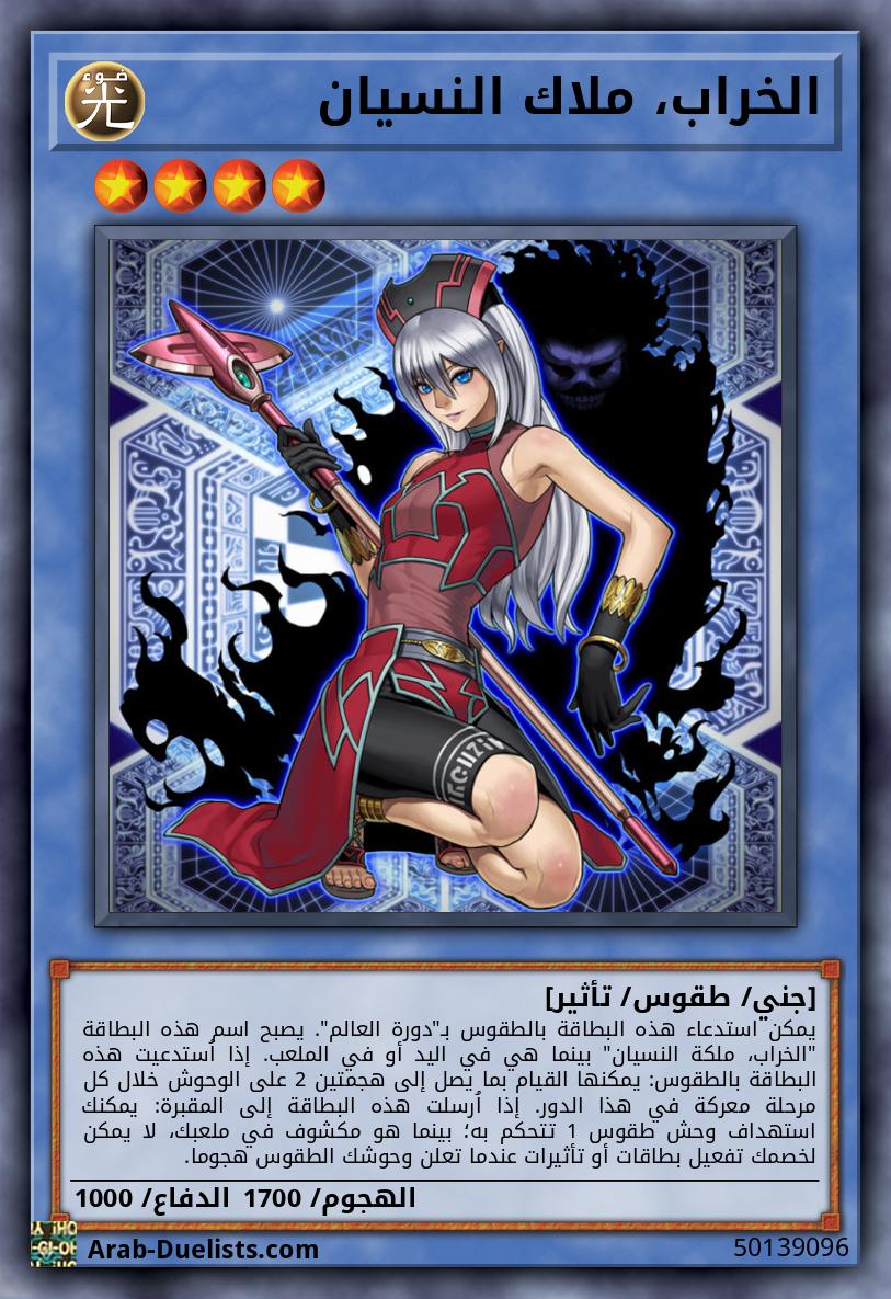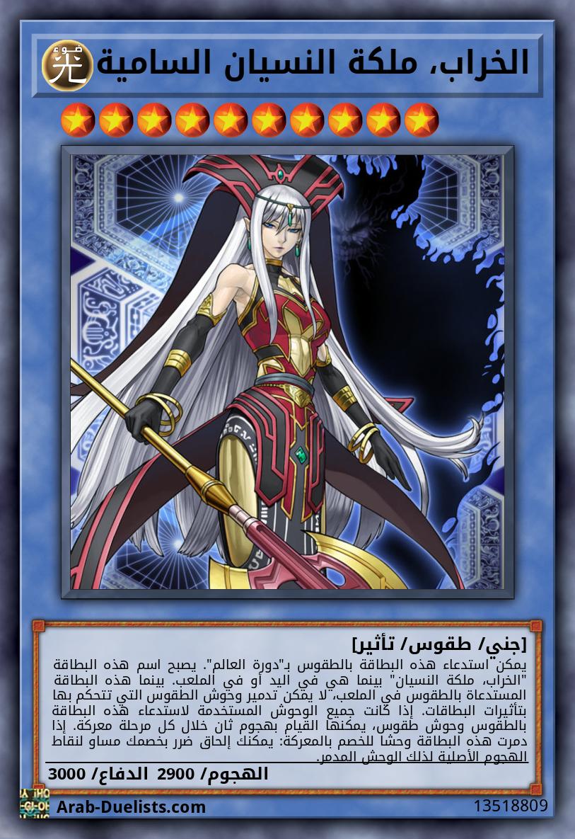يمكن استدعاء هذه البطاقة بالطقوس بـ"دورة العالم". يصبح اسم هذه البطاقة "الخراب، ملكة النسيان" بينما هي في اليد أو في الملعب. بينما هذه البطاقة المستدعاة بالطقوس في الملعب، لا يمكن تدمير وحوش الطقوس التي تتحكم بها بتأثيرات البطاقات. إذا كانت جميع الوحوش المستخدمة لاستدعاء هذه البطاقة بالطقوس وحوش طقوس، يمكنها القيام بهجوم ثان خلال كل مرحلة معركة. إذا دمرت هذه البطاقة وحشا للخصم بالمعركة: يمكنك إلحاق ضرر بخصمك مساو لنقاط الهجوم الأصلية لذلك الوحش المدمر.