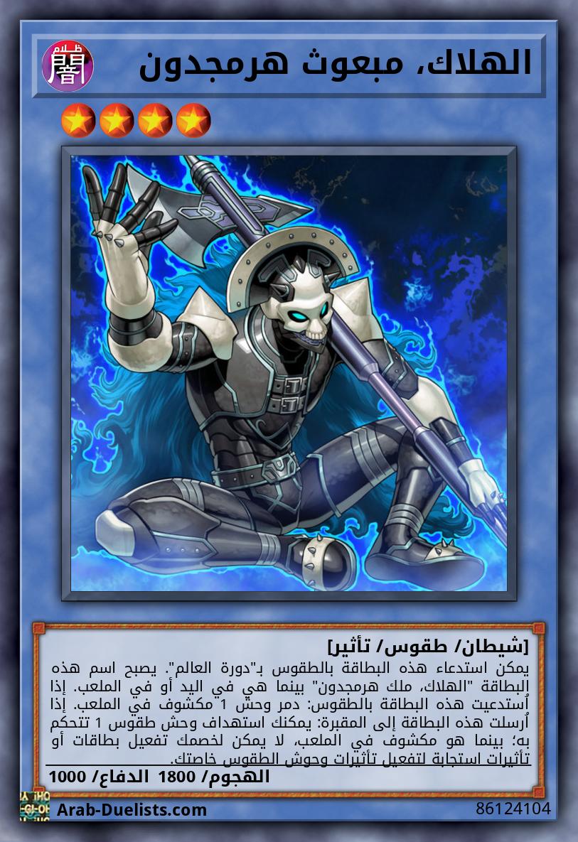 يمكنك استدعاء هذه البطاقة بالطقوس بـ"دورة العالم". يصبح اسم هذه البطاقة "الهلاك، ملك هرمجدون" بينما هي في اليد أو في الملعب. بينما هذه البطاقة المستدعاة بالطقوس في الملعب، لا يمكن تدمير وحوش الطقوس خاصتك بالمعركة. إذا كانت جميع الوحوش المستخدمه لاستدعاء هذه البطاقة بالطقوس وحوش طقوس، لا تدفع نقاط حياة لتفعيل تأثيراتها. مرة كل دور: يمكنك دفع 2000 نقطة حياة؛ دمر أكبر عدد ممكن من البطاقات في الملعب، وإذا فعلت، ألحق 200 نقطة ضرر بخصمك لكل بطاقة مدمرة يتحكم بها.