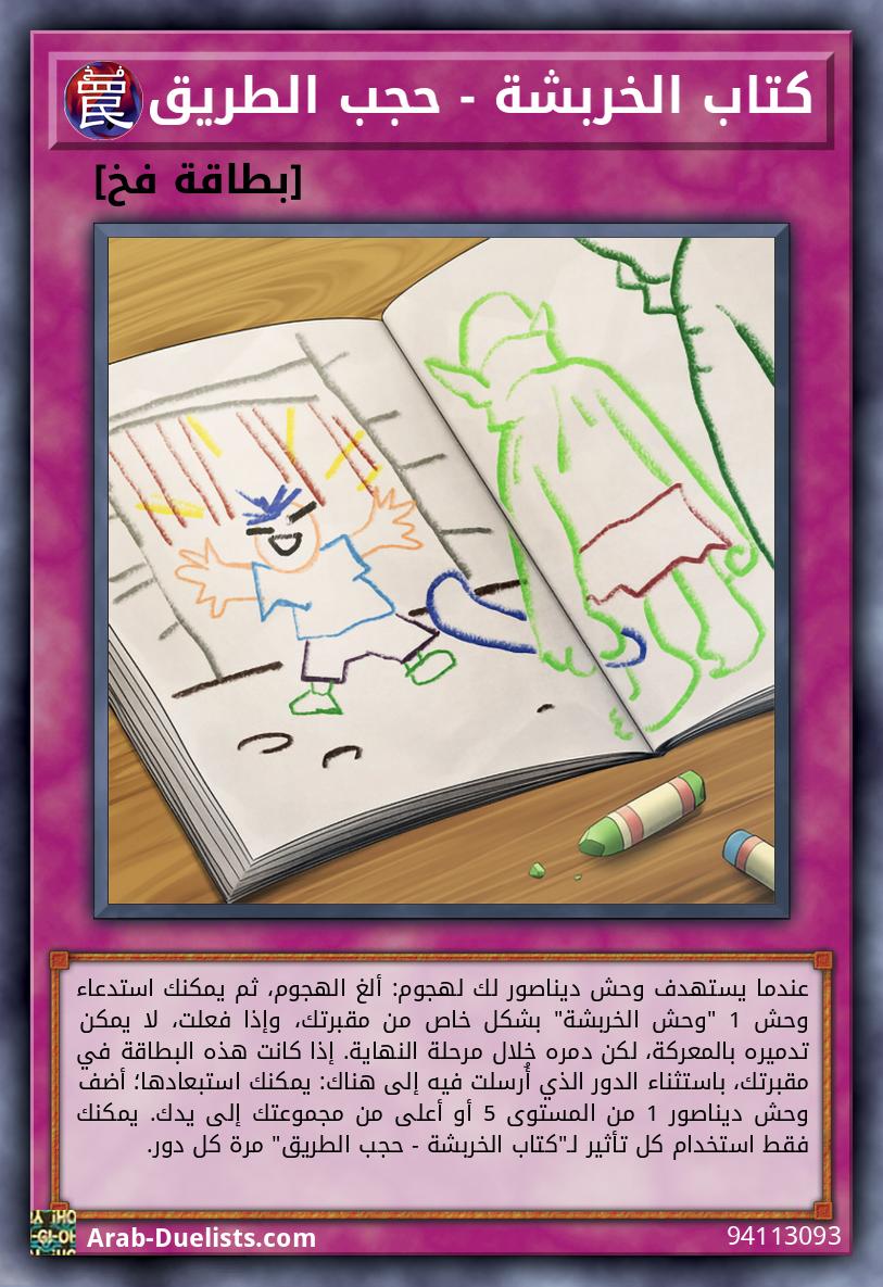 عندما يستهدف وحش ديناصور لك لهجوم: ألغ الهجوم، ثم يمكنك استدعاء وحش 1 "وحش الخربشة" بشكل خاص من مقبرتك، وإذا فعلت، لا يمكن تدميره بالمعركة، لكن دمره خلال مرحلة النهاية. إذا كانت هذه البطاقة في مقبرتك، باستثناء الدور الذي أُرسلت فيه إلى هناك: يمكنك استبعادها؛ أضف وحش ديناصور 1 من المستوى 5 أو أعلى من مجموعتك إلى يدك. يمكنك فقط استخدام كل تأثير لـ"كتاب الخربشة - حجب الطريق" مرة كل دور.