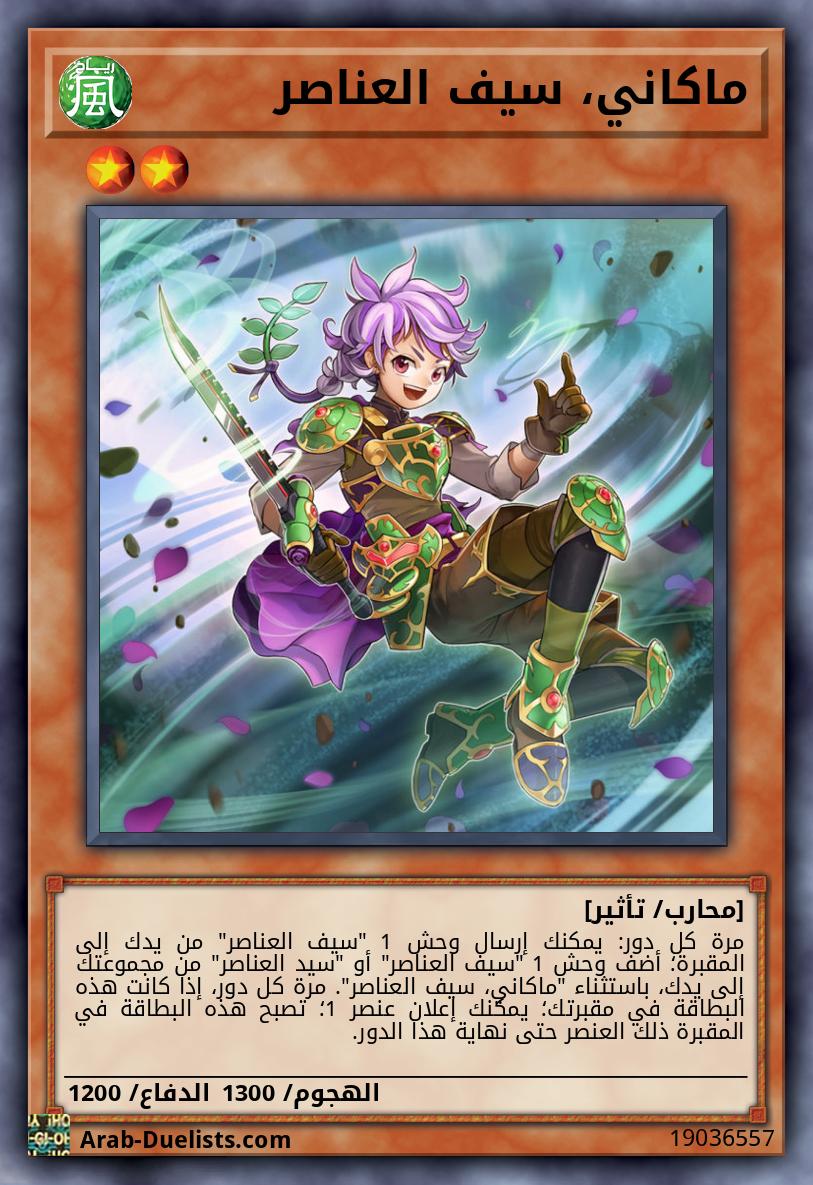 مرة كل دور: يمكنك إرسال وحش 1 "سيف العناصر" من يدك إلى المقبرة؛ أضف وحش 1 "سيف العناصر" أو "سيد العناصر" من مجموعتك إلى يدك، باستثناء "ماكاني، سيف العناصر". مرة كل دور، إذا كانت هذه البطاقة في مقبرتك؛ يمكنك إعلان عنصر 1؛ تصبح هذه البطاقة في المقبرة ذلك العنصر حتى نهاية هذا الدور.