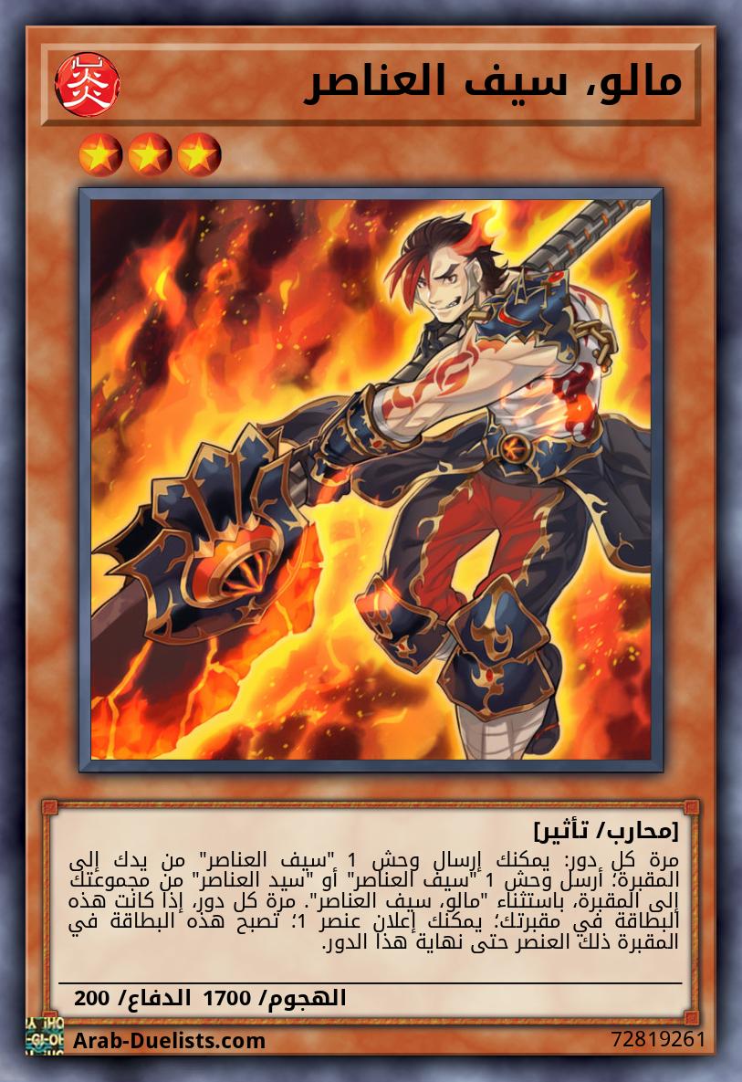 مرة كل دور: يمكنك إرسال وحش 1 "سيف العناصر" من يدك إلى المقبرة؛ أرسل وحش 1 "سيف العناصر" أو "سيد العناصر" من مجموعتك إلى المقبرة، باستثناء "مالو، سيف العناصر". مرة كل دور، إذا كانت هذه البطاقة في مقبرتك؛ يمكنك إعلان عنصر 1؛ تصبح هذه البطاقة في المقبرة ذلك العنصر حتى نهاية هذا الدور.