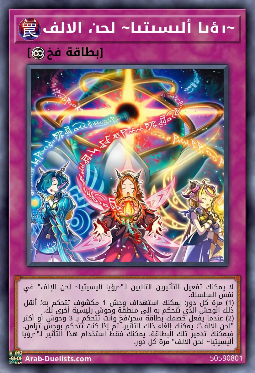 لا يمكنك تفعيل التأثيرين التاليين لـ"~رؤيا أليسيتيا~ لحن الإلف" في نفس السلسلة. (1) مرة كل دور: يمكنك استهداف وحش 1 مكشوف تتحكم به؛ أنقل ذلك الوحش الذي تتحكم به إلى منطقة وحوش رئيسية أخرى لك. (2) عندما يفعل خصمك بطاقة سحر/فخ وأنت تتحكم بـ 3 وحوش أو أكثر "لحن الإلف": يمكنك إلغاء ذلك التأثير، ثم إذا كنت تتحكم بوحش تزامن، فيمكنك تدمير تلك البطاقة. يمكنك فقط استخدام هذا التأثير لـ"~رؤيا أليسيتيا~ لحن الإلف" مرة كل دور.