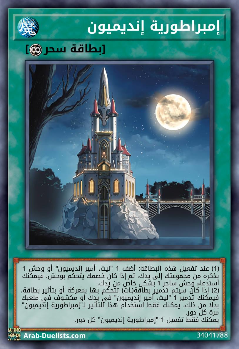(1) عند تفعيل هذه البطاقة: أضف 1 "ليث، أمير إنديميون" أو وحش 1 يذكره من مجموعتك إلى يدك، ثم إذا كان خصمك يتحكم بوحش، فيمكنك استدعاء وحش ساحر 1 بشكل خاص من يدك. (2) إذا كان سيتم تدمير بطاقة(ـات) تتحكم بها بمعركة أو بتأثير بطاقة، فيمكنك تدمير 1 "ليث، أمير إنديميون" في يدك أو مكشوف في ملعبك بدلا من ذلك. يمكنك فقط استخدام هذا التأثير لـ"إمبراطورية إنديميون" مرة كل دور. يمكنك فقط تفعيل 1 "إمبراطورية إنديميون" كل دور.