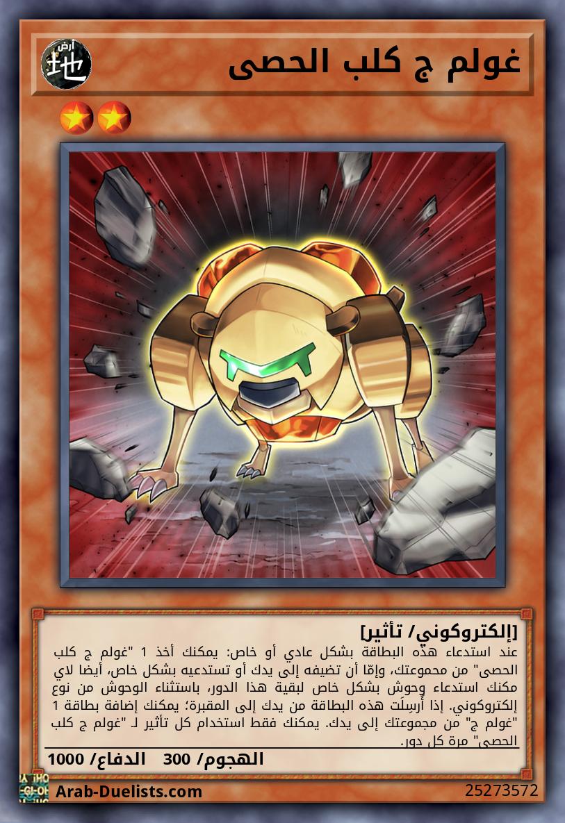 عند استدعاء هذه البطاقة بشكل عادي أو خاص: يمكنك أخذ 1 "غولم ج كلب الحصى" من محموعتك، وإمّا أن تضيفه إلى يدك أو تستدعيه بشكل خاص، أيضا لاي مكنك استدعاء وحوش بشكل خاص لبقية هذا الدور، باستثناء الوحوش من نوع إلكتروكوني. إذا أُرسِلَت هذه البطاقة من يدك إلى المقبرة؛ يمكنك إضافة بطاقة 1 "غولم ج" من مجموعتك إلى يدك. يمكنك فقط استخدام كل تأثير لـ "غولم ج كلب الحصى" مرة كل دور.