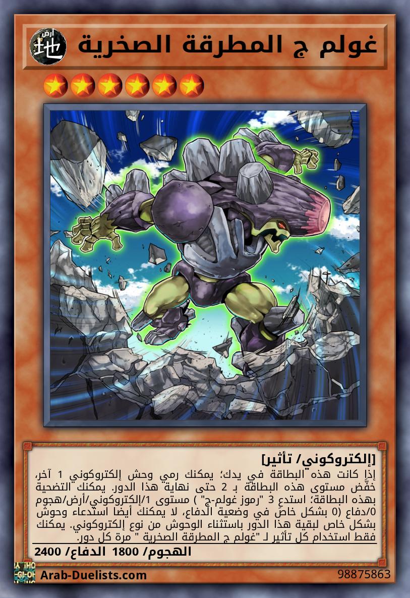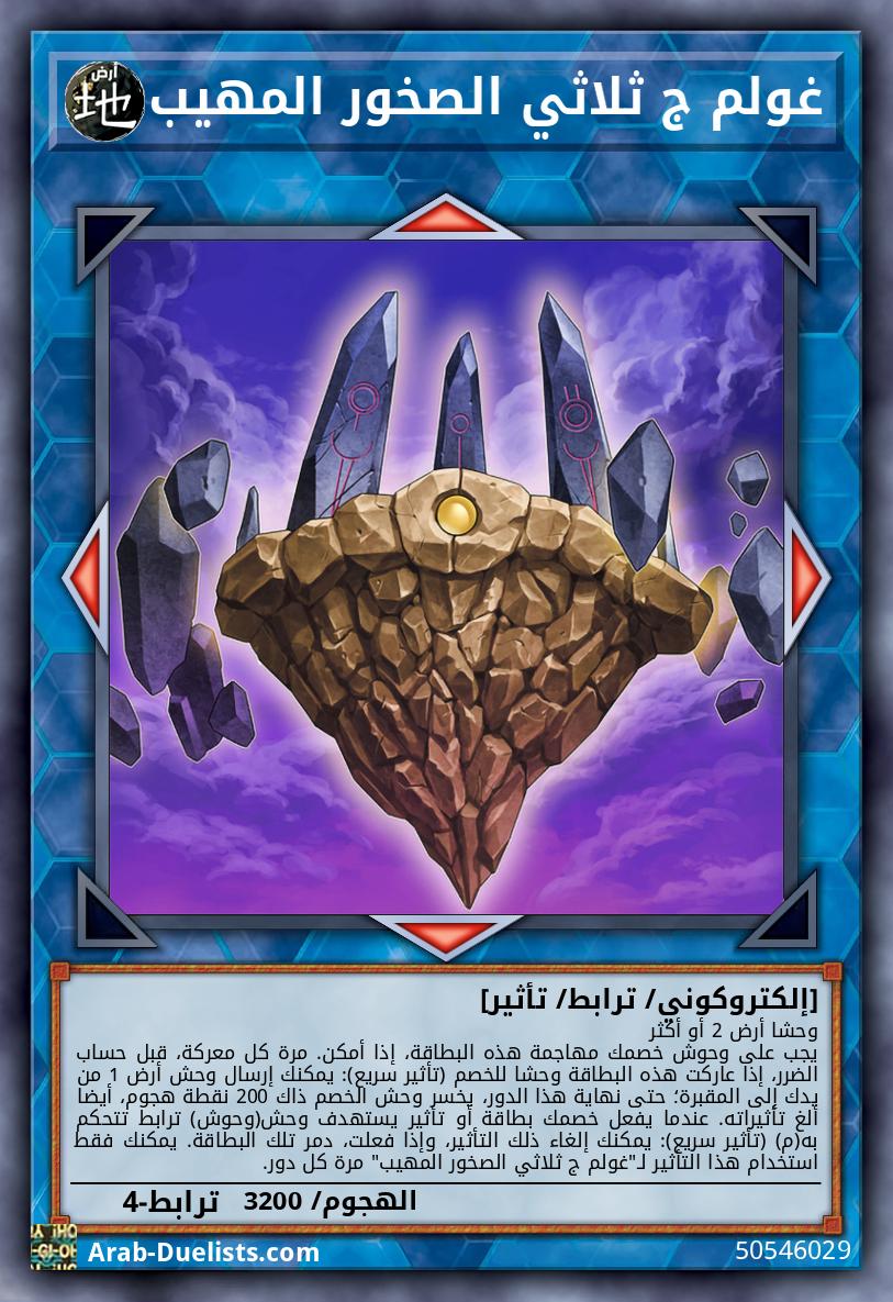 وحشا أرض 2 أو أكثر يجب على وحوش خصمك مهاجمة هذه البطاقة، إذا أمكن. مرة كل معركة، قبل حساب الضرر، إذا عاركت هذه البطاقة وحشا للخصم (تأثير سريع): يمكنك إرسال وحش أرض 1 من يدك إلى المقبرة؛ حتى نهاية هذا الدور، يخسر وحش الخصم ذاك 200 نقطة هجوم، أيضا ألغ تأثيراته. عندما يفعل خصمك بطاقة أو تأثير يستهدف وحش(وحوش) ترابط تتحكم به(م) (تأثير سريع): يمكنك إلغاء ذلك التأثير، وإذا فعلت، دمر تلك البطاقة. يمكنك فقط استخدام هذا التأثير لـ"غولم ج ثلاثي الصخور المهيب" مرة كل دور.