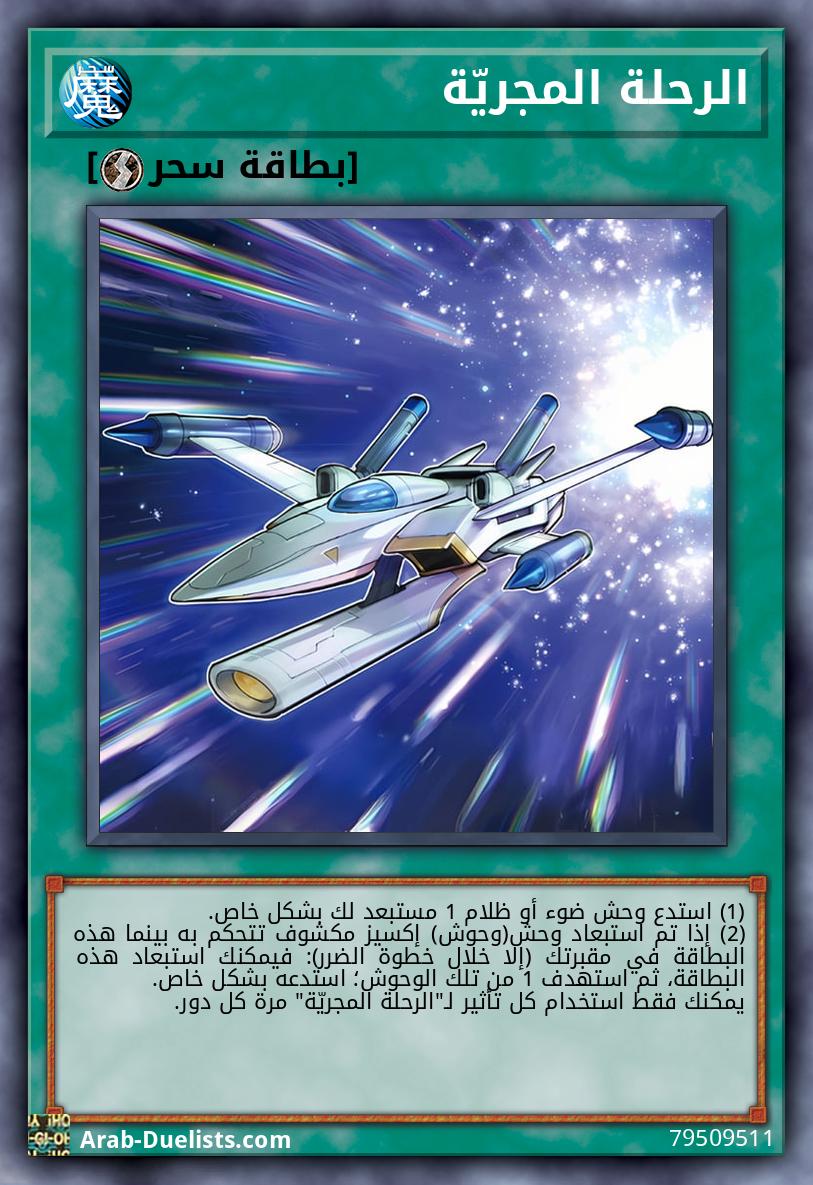 (1) استدع وحش ضوء أو ظلام 1 مستبعد لك بشكل خاص. (2) إذا تم استبعاد وحش(وحوش) إكسيز مكشوف تتحكم به بينما هذه البطاقة في مقبرتك (إلا خلال خطوة الضرر): فيمكنك استبعاد هذه البطاقة، ثم استهدف 1 من تلك الوحوش؛ استدعه بشكل خاص. يمكنك فقط استخدام كل تأثير لـ"الرحلة المجريّة" مرة كل دور.