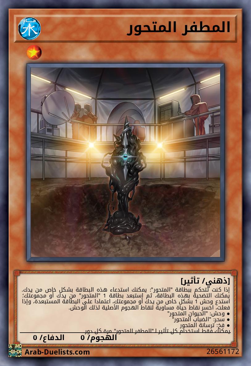 إذا كنت تتحكم ببطاقة "المتحور": يمكنك استدعاء هذه البطاقة بشكل خاص من يدك. يمكنك التضحية بهذه البطاقة، ثم استبعد بطاقة 1 "المتحور" من يدك أو مجموعتك؛ استدع وحش 1 بشكل خاص من يدك أو مجموعتك، اعتمادا على البطاقة المستبعدة، وإذا فعلت، اخسر نقاط حياة مساوية لنقاط الهجوم الأصلية لذلك الوحش. ● وحش: "الحيوان المتحور" ● سحر: "الضباب المتحور" ● فخ: ترسانة المتحور يمكنك فقط استخدام كل تأثير لـ"المطفر المتحور" مرة كل دور.