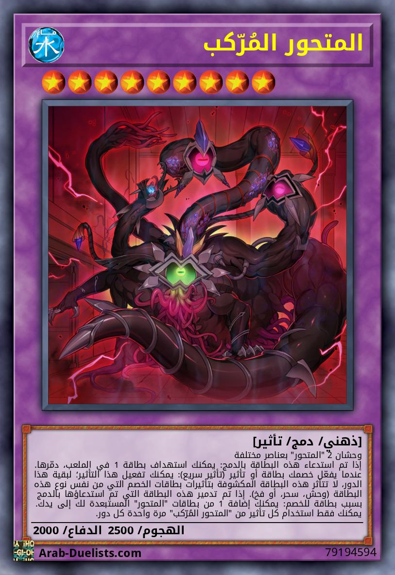 وحشان 2 "المتحور" بعناصر مختلفة إذا تم استدعاء هذه البطاقة بالدمج: يمكنك استهداف بطاقة 1 في الملعب، دمّرها. عندما يفعّل خصمك بطاقة أو تأثير (تأثير سريع): يمكنك تفعيل هذا التأثير؛ لبقية هذا الدور، لا تتأثر هذه البطاقة المكشوفة بتأثيرات بطاقات الخصم التي من نفس نوع هذه البطاقة (وحش، سحر، أو فخ). إذا تم تدمير هذه البطاقة التي تم استدعاؤها بالدمج بسبب بطاقة للخصم: يمكنك إضافة 1 من بطاقات "المتحور" المستبعدة لك إلى يدك. يمكنك فقط استخدام كل تأثير من "المتحور المُرّكب" مرة واحدة كل دور.
