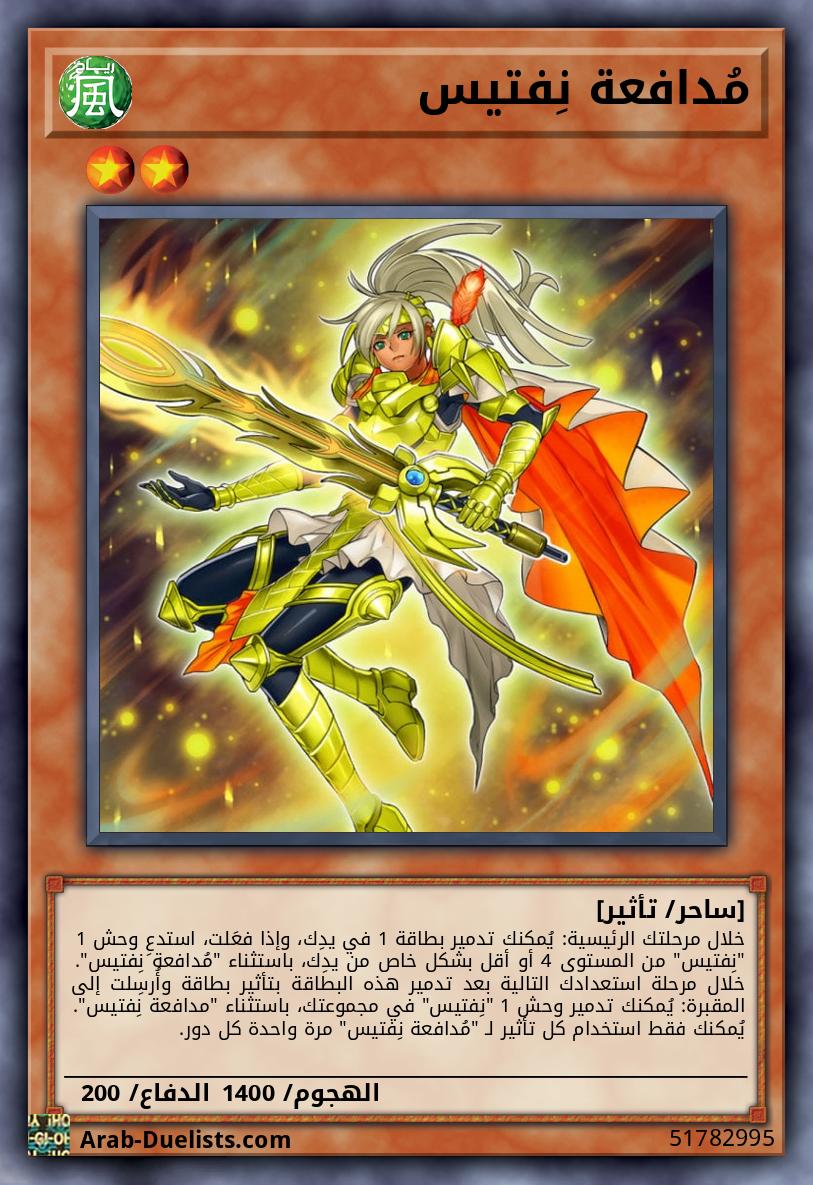 خلال مرحلتك الرئيسية: يُمكنك تدمير بطاقة 1 في يدِك، وإذا فعَلت، استدعِ وحش 1 "نِفتيس" من المستوى 4 أو أقل بشكل خاص من يدِك، باستثناء "مُدافعة نِفتيس". خلال مرحلة استعدادك التالية بعد تدمير هذه البطاقة بتأثير بطاقة وأُرسِلت إلى المقبرة: يُمكنك تدمير وحش 1 "نِفتيس" في مجموعتك، باستثناء "مدافعة نِفتيس". يُمكنك فقط استخدام كل تأثير لـ "مُدافعة نِفتيس" مرة واحدة كل دور.