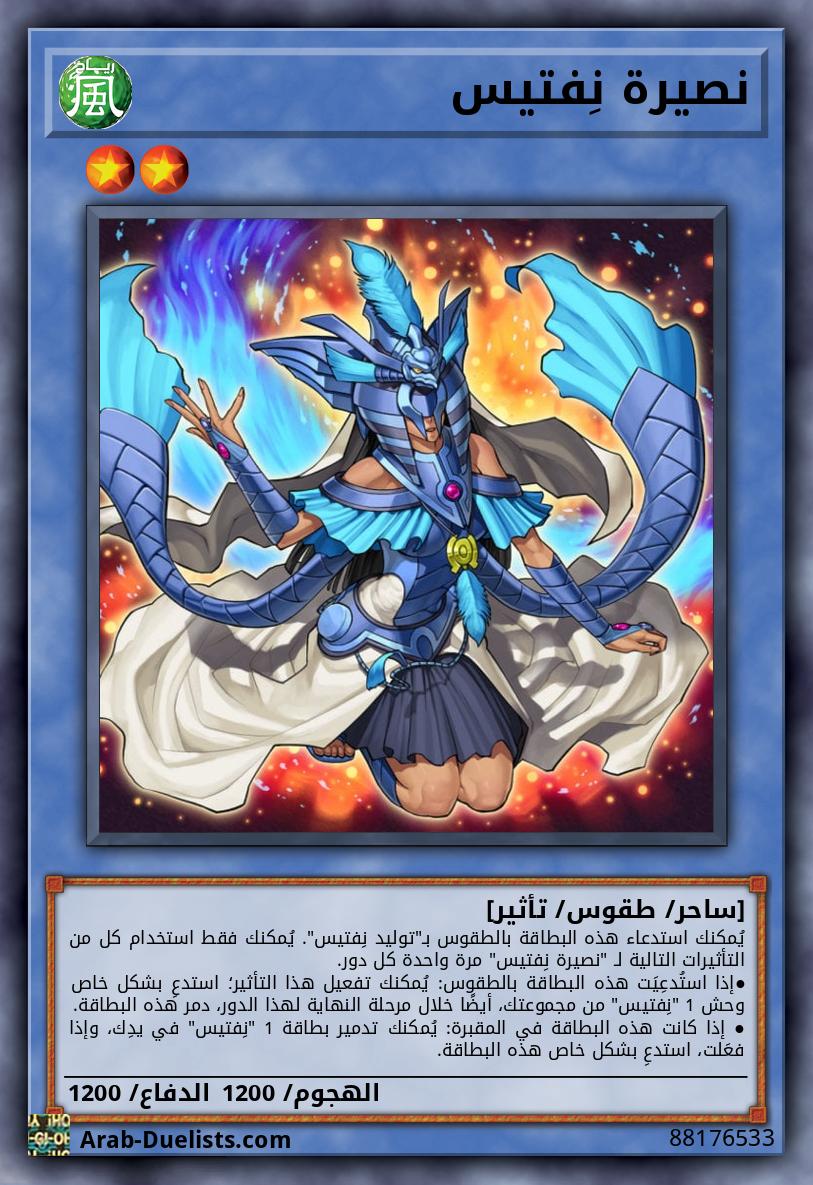 يُمكنك استدعاء هذه البطاقة بالطقوس بـ"توليد نِفتيس". يُمكنك فقط استخدام كل من التأثيرات التالية لـ "نصيرة نِفتيس" مرة واحدة كل دور. ●إذا استُدعِيَت هذه البطاقة بالطقوس: يُمكنك تفعيل هذا التأثير؛ استدعِ بشكل خاص وحش 1 "نِفتيس" من مجموعتك، أيضًا خلال مرحلة النهاية لهذا الدور، دمر هذه البطاقة. ● إذا كانت هذه البطاقة في المقبرة: يُمكنك تدمير بطاقة 1 "نِفتيس" في يدِك، وإذا فعَلت، استدعِ بشكل خاص هذه البطاقة.