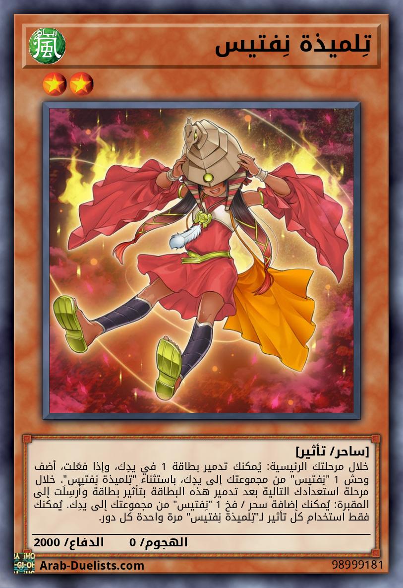 خلال مرحلتك الرئيسية: يُمكنك تدمير بطاقة 1 في يدِك، وإذا فعَلت، أضف وحش 1 "نِفتيس" من مجموعتك إلى يدِك، باستثناء "تِلميذة نِفتيس". خلال مرحلة استعدادك التالية بعد تدمير هذه البطاقة بتأثير بطاقة وأُرسِلَت إلى المقبرة: يُمكنك إضافة سحر / فخ 1 "نِفتيس" من مجموعتك إلى يدِك. يُمكنك فقط استخدام كل تأثير لـ"تِلميذة نِفتيس" مرة واحدة كل دور.