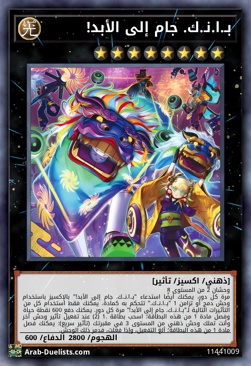 وحشان 2 من المستوى 8 مرة كل دور، يمكنك أيضًا استدعاء "بـ.ا.نـ.ك. جام إلى الأبد!" بالإكسيز باستخدام وحش دمج أو تزامن 1 "بـ.ا.نـ.ك." تتحكم به كمادة. يمكنك فقط استخدام كل من التأثيرات التالية لـ"بـ.ا.نـ.ك. جام إلى الأبد!" مرة كل دور. يمكنك دفع 600 نقطة حياة وفصل مادة 1 من هذه البطاقة؛ اسحب بطاقة 1. (2) عند تفعيل تأثير وحش آخر وأنت تملك وحش ذهني من المستوى 3 في مقبرتك (تأثير سريع): يمكنك فصل مادة 1 من هذه البطاقة؛ ألغ التفعيل، وإذا فعلت، فدمر ذلك الوحش.