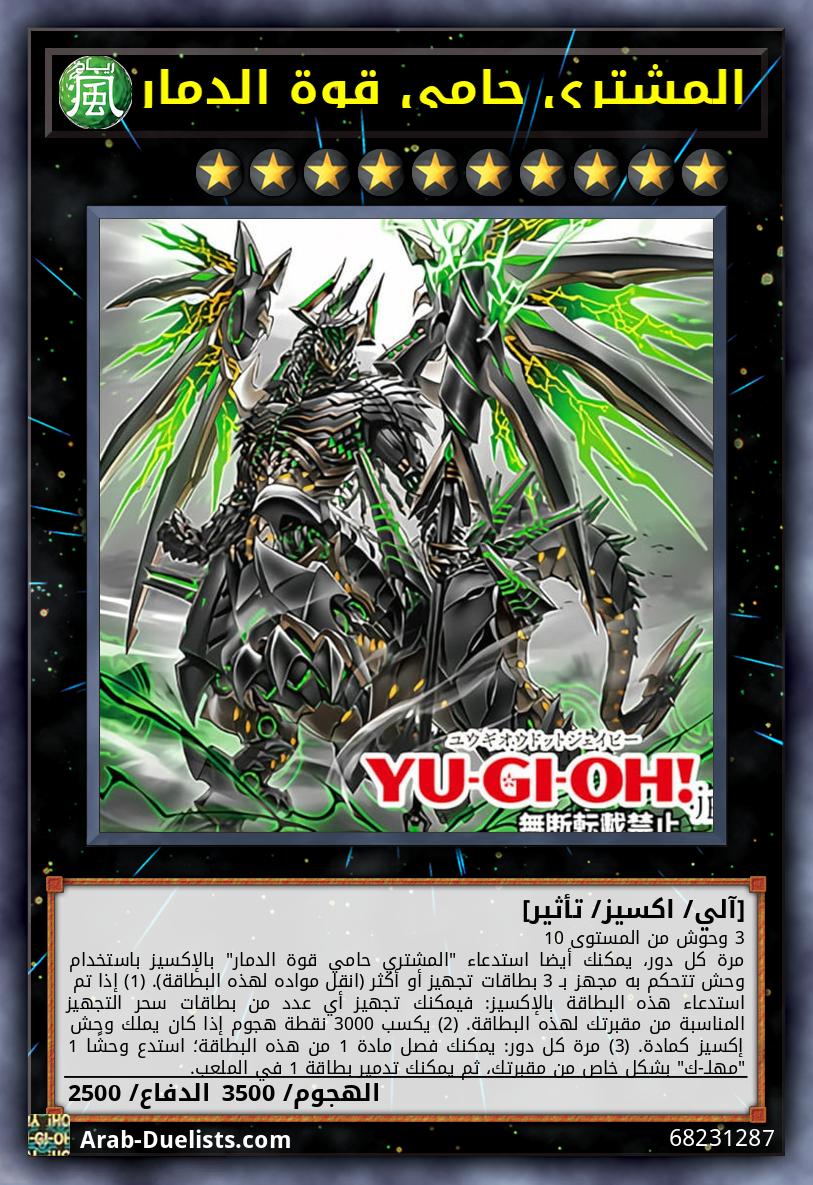 3 وحوش من المستوى 10 مرة كل دور، يمكنك أيضا استدعاء "المشتري حامي قوة الدمار" بالإكسيز باستخدام وحش تتحكم به مجهز بـ 3 بطاقات تجهيز أو أكثر (انقل مواده لهذه البطاقة). (1) إذا تم استدعاء هذه البطاقة بالإكسيز: فيمكنك تجهيز أي عدد من بطاقات سحر التجهيز المناسبة من مقبرتك لهذه البطاقة. (2) يكسب 3000 نقطة هجوم إذا كان يملك وحش إكسيز كمادة. (3) مرة كل دور: يمكنك فصل مادة 1 من هذه البطاقة؛ استدع وحشًا 1 "مهلـ-ك" بشكل خاص من مقبرتك، ثم يمكنك تدمير بطاقة 1 في الملعب.