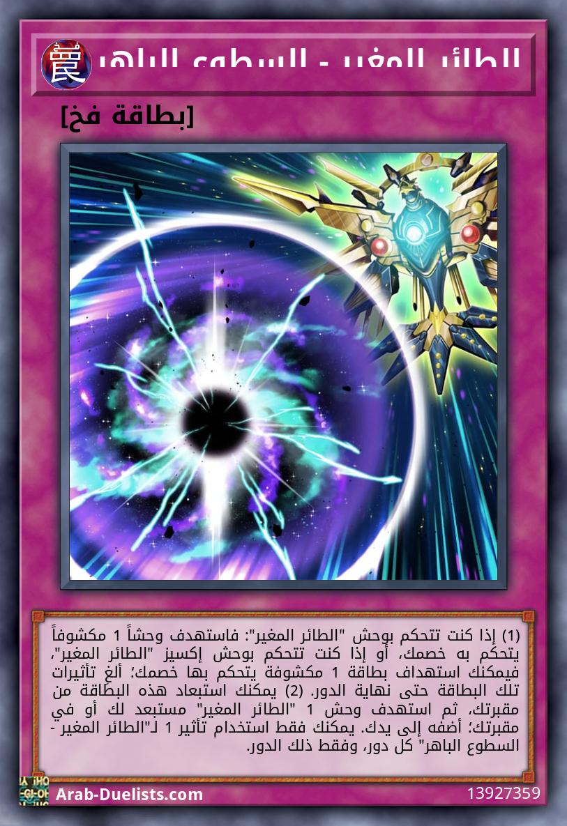 (1) إذا كنت تتحكم بوحش "الطائر المغير": فاستهدف وحشاً 1 مكشوفاً يتحكم به خصمك، أو إذا كنت تتحكم بوحش إكسيز "الطائر المغير"، فيمكنك استهداف بطاقة 1 مكشوفة يتحكم بها خصمك؛ ألغِ تأثيرات تلك البطاقة حتى نهاية الدور. (2) يمكنك استبعاد هذه البطاقة من مقبرتك، ثم استهدف وحش 1 "الطائر المغير" مستبعد لك أو في مقبرتك؛ أضفه إلى يدك. يمكنك فقط استخدام تأثير 1 لـ"الطائر المغير - السطوع الباهر" كل دور، وفقط ذلك الدور.