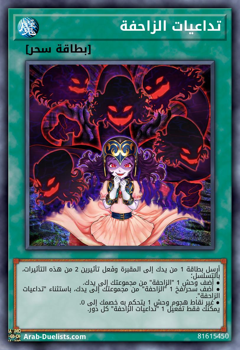 أرسل بطاقة 1 من يدك إلى المقبرة وفَعل تأثيرين 2 من هذه التأثيرات، بالتسلسل؛ ● أضف وحش 1 "الزاحفة" من مجموعتك إلى يدك. ● أضف سحر/فخ 1 "الزاحفة" من مجموعتك إلى يدك، باستثناء "تداعيات الزاحفة". ● غير نقاط هجوم وحش 1 يتحكم به خصمك إلى 0. يمكنك فقط تفعيل 1 "تداعيات الزاحفة" كل دور.