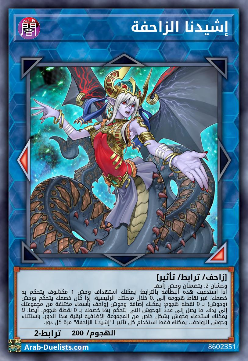 وحشان 2، يتضمنان وحش زاحف إذا استدعيت هذه البطاقة بالترابط: يمكنك استهداف وحش 1 مكشوف يتحكم به خصمك؛ غير نقاط هجومه إلى 0. خلال مرحلتك الرئيسية، إذا كان خصمك يتحكم بوحش (وحوش) بـ 0 نقطة هجوم: يمكنك إضافة وحوش زواحف بأسماء مختلفة من مجموعتك إلى يدك، ما يصل إلى عدد الوحوش التي يتحكم بها خصمك بـ 0 نقطة هجوم، أيضا، لا يمكنك استدعاء وحوش بشكل خاص من المجموعة الإضافية لبقية هذا الدور، باستثناء وحوش الزواحف. يمكنك فقط استخدام كل تأثير لـ"إشيدنا الزاحفة" مرة كل دور.
