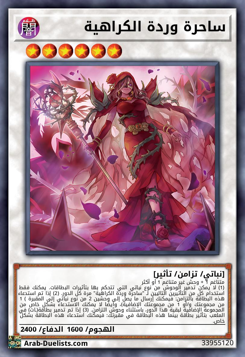 متناغم 1 + وحش غير متناغم 1 أو أكثر (1) لا يمكن تدمير الوحوش من نوع نباتي التي تتحكم بها بتأثيرات البطاقات. يمكنك فقط استخدام كل من التأثيرين التاليين لـ "ساحرة وردة الكراهية" مرة كل الدور. (2) إذا تم استدعاء هذه البطاقة بالتزامن: فيمكنك إرسال ما يصل إلى وحشين 2 من نوع نباتي إلى المقبرة ( 1 من مجموعتك و/أو 1 من مجموعتك الإضافية)، وأيضًا لا يمكنك الاستدعاء بشكل خاص من المجموعة الإضافية لبقية هذا الدور، باستثناء وحوش التزامن. (3) إذا تم تدمير بطاقة(ـات) في الملعب بتأثير بطاقة بينما هذه البطاقة في مقبرتك: فيمكنك استدعاء هذه البطاقة بشكل خاص.