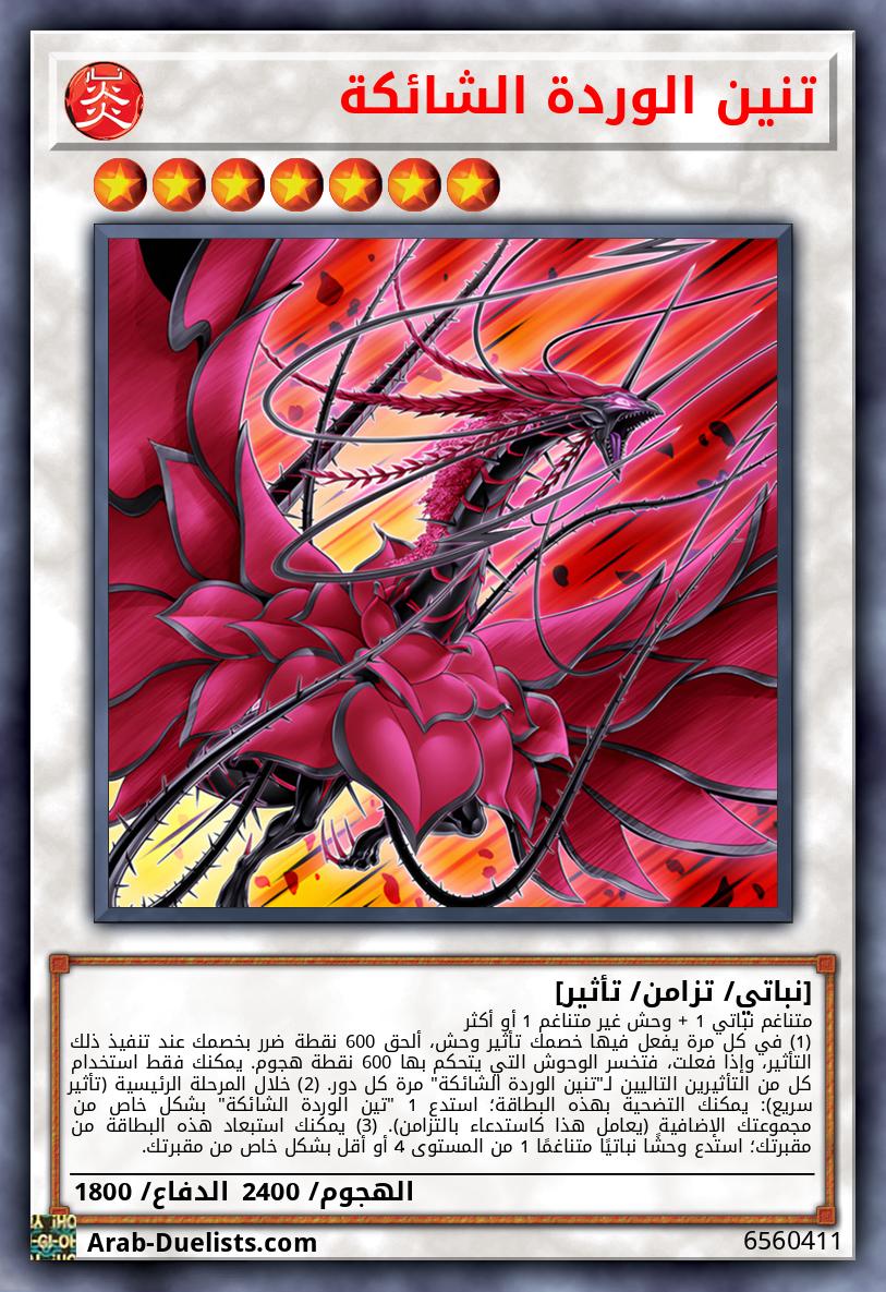 متناغم نباتي 1 + وحش غير متناغم 1 أو أكثر (1) في كل مرة يفعل فيها خصمك تأثير وحش، ألحق 600 نقطة ضرر بخصمك عند تنفيذ ذلك التأثير، وإذا فعلت، فتخسر الوحوش التي يتحكم بها 600 نقطة هجوم. يمكنك فقط استخدام كل من التأثيرين التاليين لـ"تنين الوردة الشائكة" مرة كل دور. (2) خلال المرحلة الرئيسية (تأثير سريع): يمكنك التضحية بهذه البطاقة؛ استدع 1 "تين الوردة الشائكة" بشكل خاص من مجموعتك الإضافية (يعامل هذا كاستدعاء بالتزامن). (3) يمكنك استبعاد هذه البطاقة من مقبرتك؛ استدع وحشًا نباتيًا متناغمًا 1 من المستوى 4 أو أقل بشكل خاص من مقبرتك.