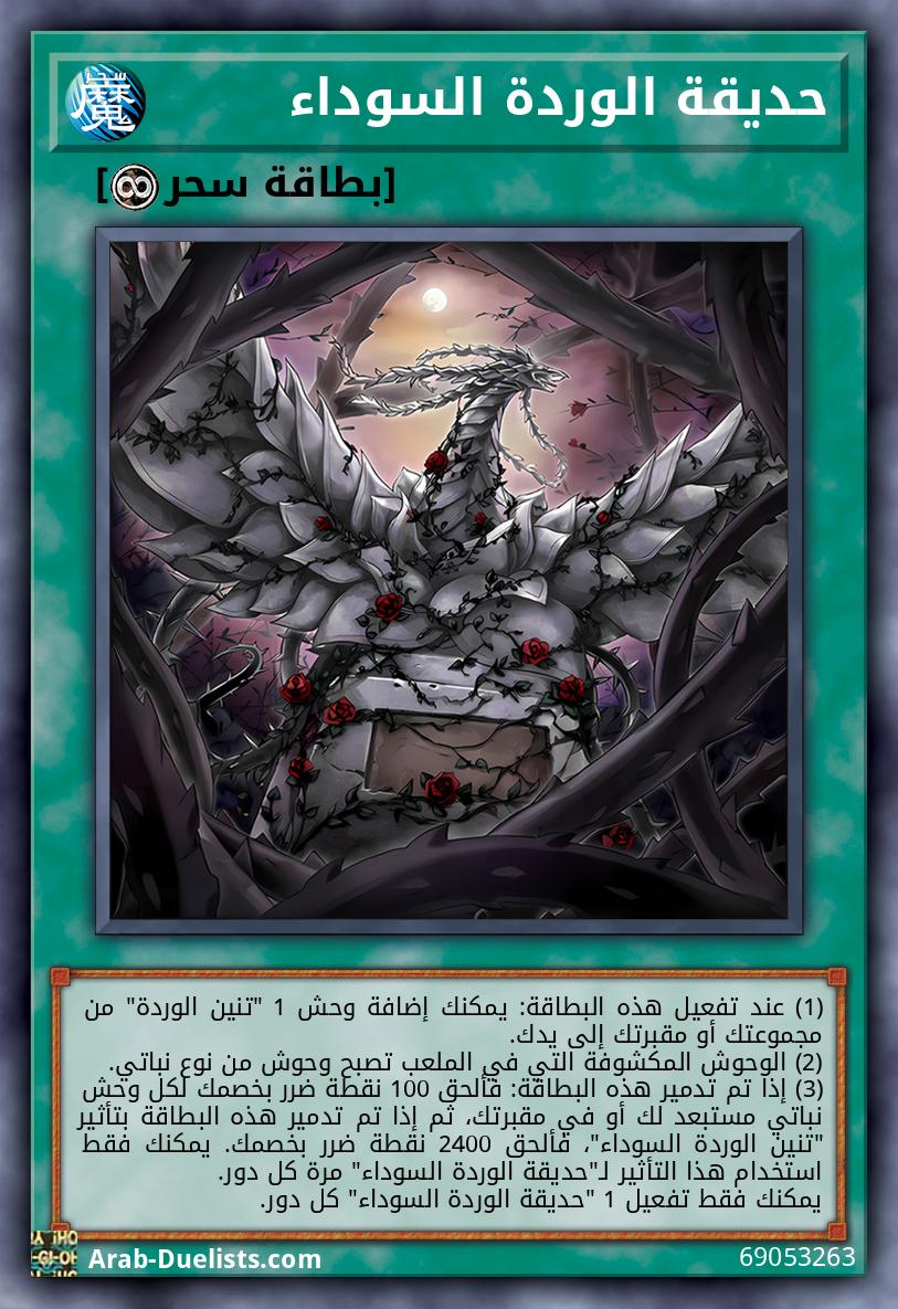 (1) عند تفعيل هذه البطاقة: يمكنك إضافة وحش 1 "تنين الوردة" من مجموعتك أو مقبرتك إلى يدك. (2) الوحوش المكشوفة التي في الملعب تصبح وحوش من نوع نباتي. (3) إذا تم تدمير هذه البطاقة: فألحق 100 نقطة ضرر بخصمك لكل وحش نباتي مستبعد لك أو في مقبرتك، ثم إذا تم تدمير هذه البطاقة بتأثير "تنين الوردة السوداء"، فألحق 2400 نقطة ضرر بخصمك. يمكنك فقط استخدام هذا التأثير لـ"حديقة الوردة السوداء" مرة كل دور. يمكنك فقط تفعيل 1 "حديقة الوردة السوداء" كل دور.