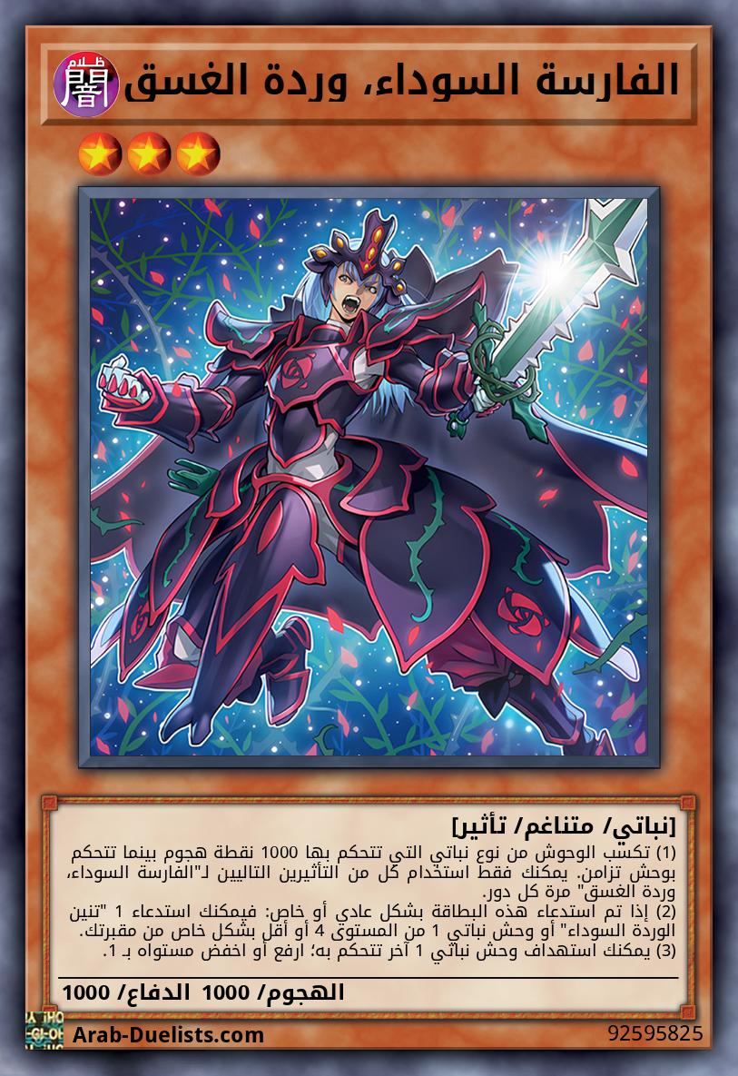 (1) تكسب الوحوش من نوع نباتي التي تتحكم بها 1000 نقطة هجوم بينما تتحكم بوحش تزامن. يمكنك فقط استخدام كل من التأثيرين التاليين لـ"الفارسة السوداء، وردة الغسق" مرة كل دور. (2) إذا تم استدعاء هذه البطاقة بشكل عادي أو خاص: فيمكنك استدعاء 1 "تنين الوردة السوداء" أو وحش نباتي 1 من المستوى 4 أو أقل بشكل خاص من مقبرتك. (3) يمكنك استهداف وحش نباتي 1 آخر تتحكم به؛ ارفع أو اخفض مستواه بـ 1.