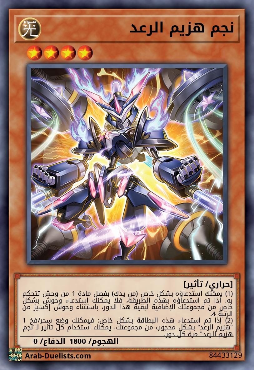 (1) يمكنك استدعاؤه بشكل خاص (من يدك) بفصل مادة 1 من وحش تتحكم به. إذا تم استدعاؤه بهذه الطريقة، فلا يمكنك استدعاء وحوش بشكل خاص من مجموعتك الإضافية لبقية هذا الدور، باستثناء وحوش إكسيز من الرتبة 4. (2) إذا تم استدعاء هذه البطاقة بشكل خاص: فيمكنك وضع سحر/فخ 1 "هزيم الرعد" بشكل محجوب من مجموعتك. يمكنك استخدام كل تأثير لـ"نجم هزيم الرعد" مرة كل دور.