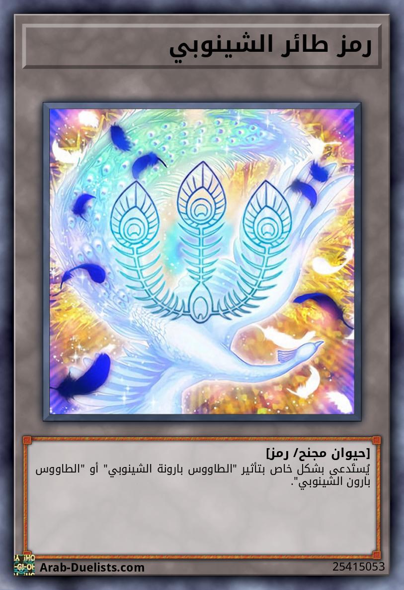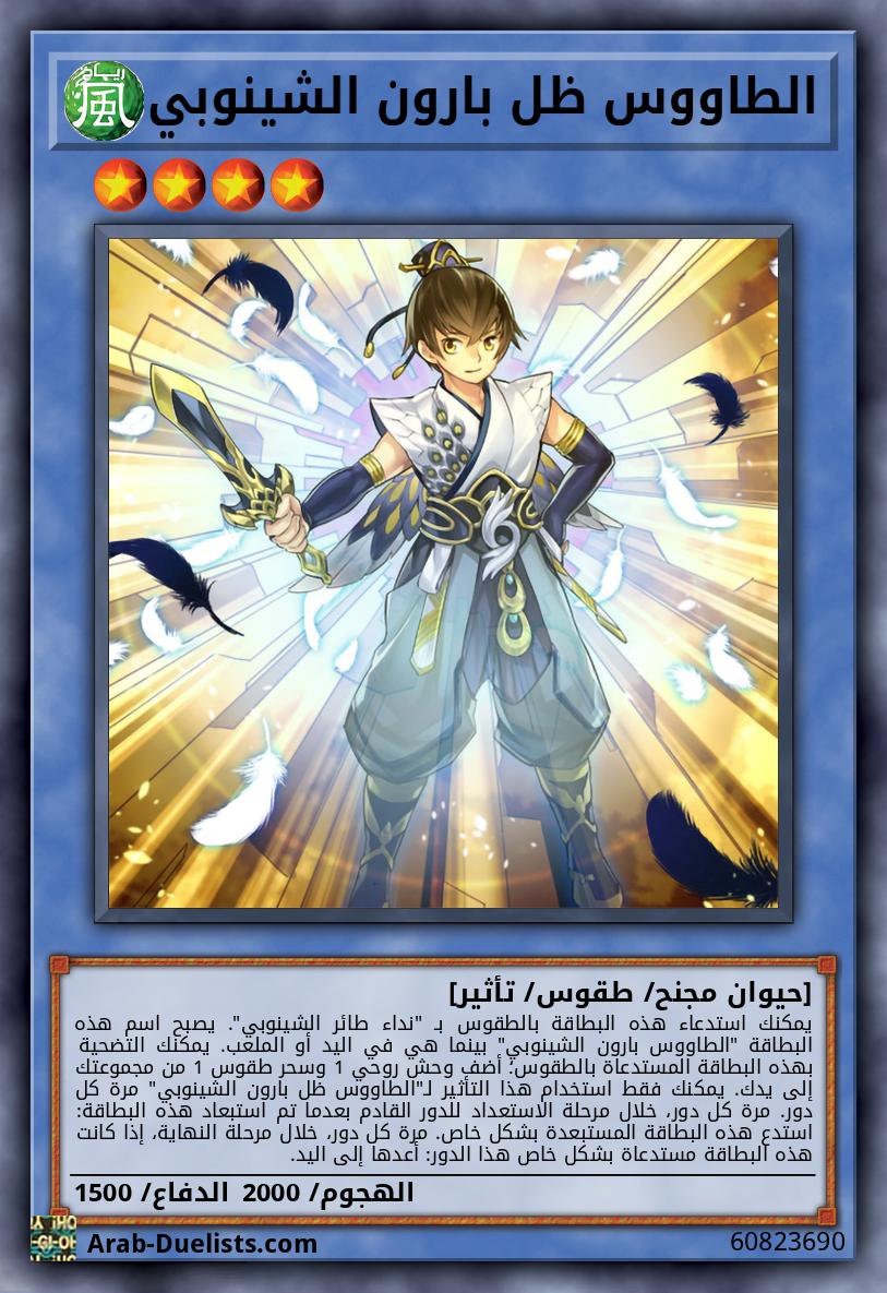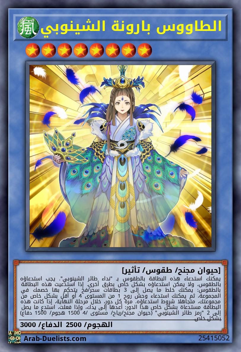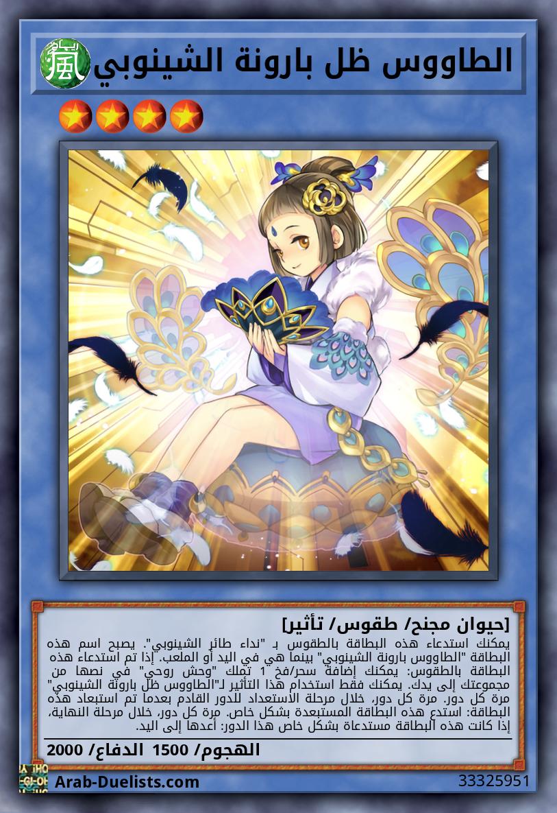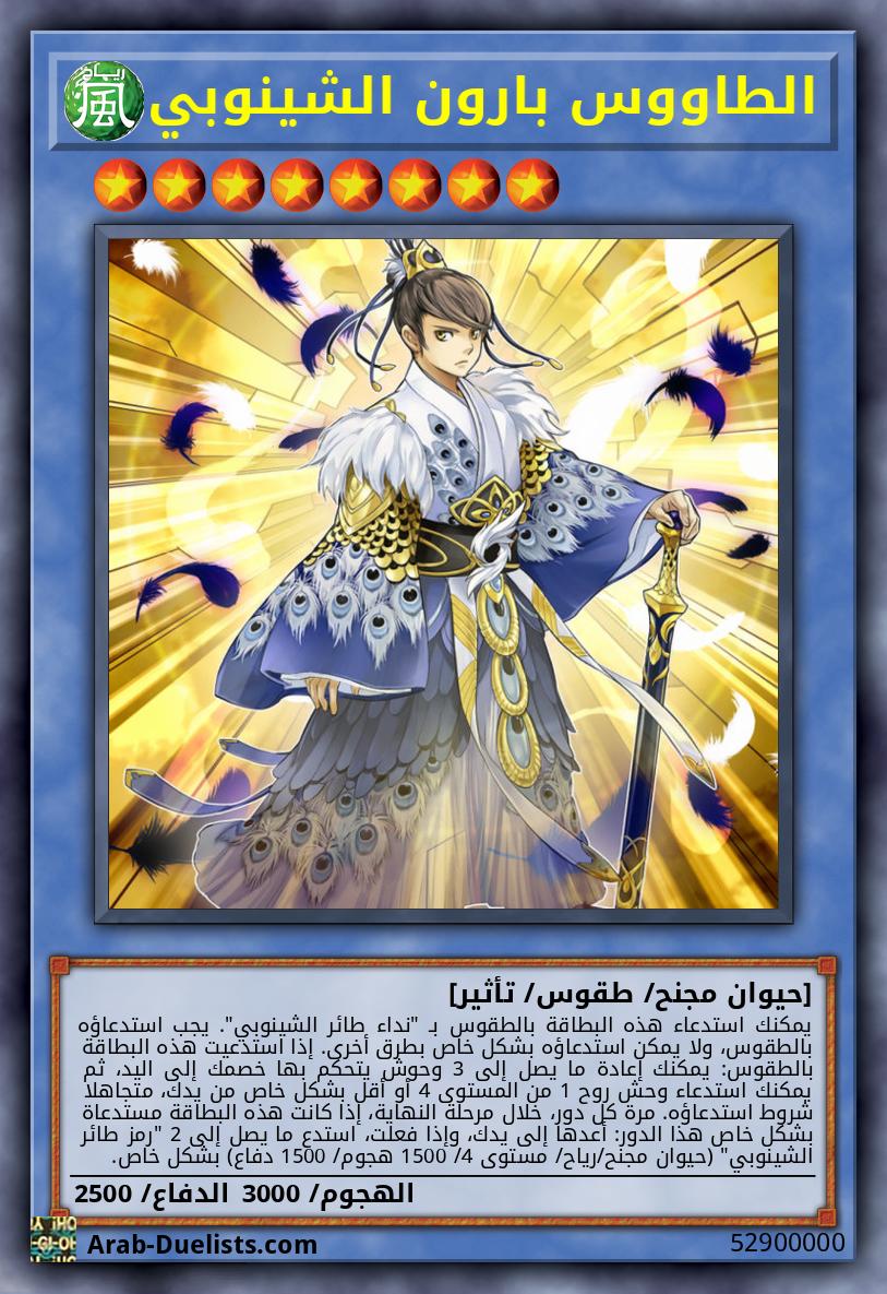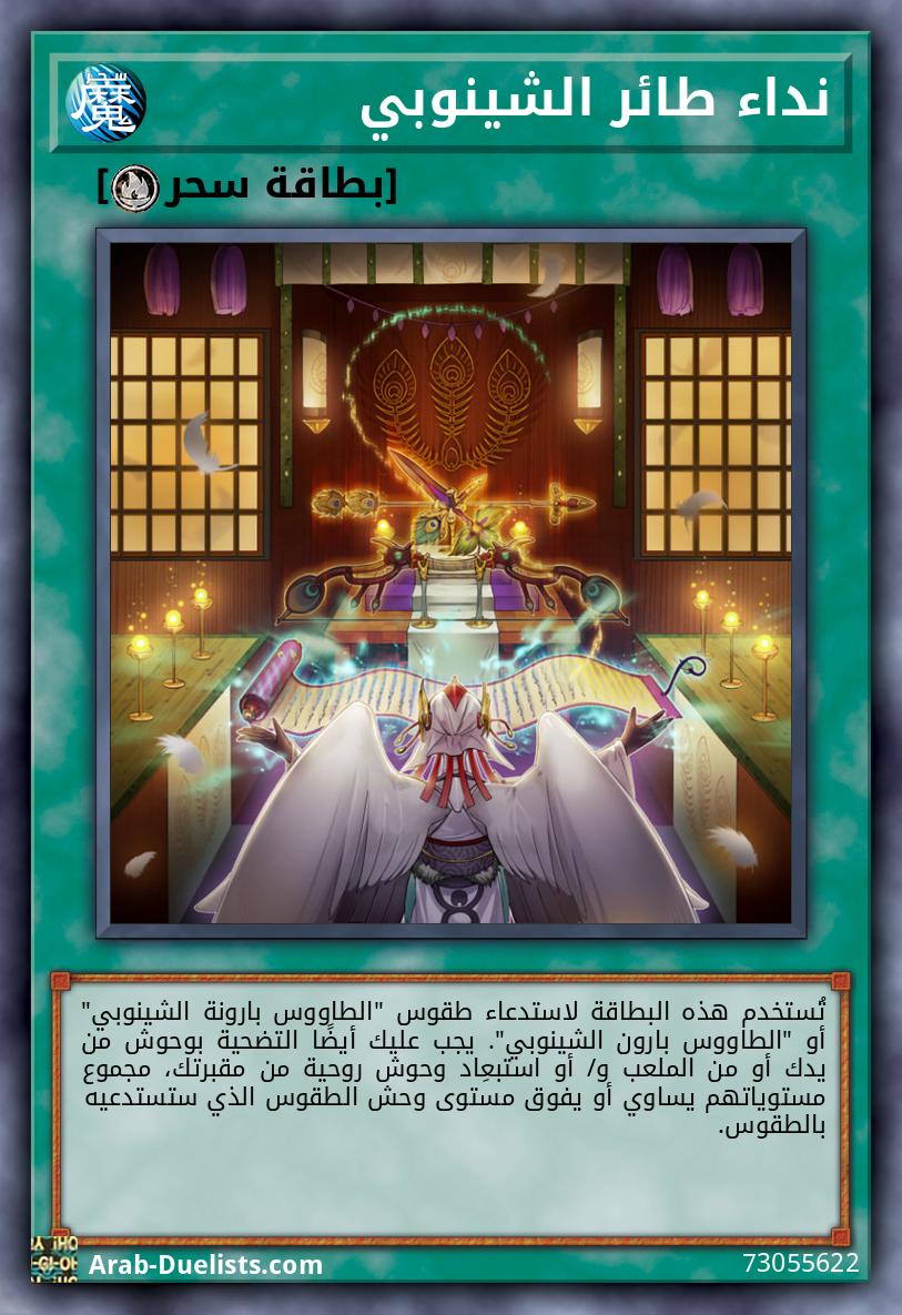 تُستخدم هذه البطاقة لاستدعاء طقوس "الطاووس بارونة الشينوبي" أو "الطاووس بارون الشينوبي". يجب عليك أيضًا التضحية بوحوش من يدك أو من الملعب و/ أو استبعِاد وحوش روحية من مقبرتك، مجموع مستوياتهم يساوي أو يفوق مستوى وحش الطقوس الذي ستستدعيه بالطقوس.
