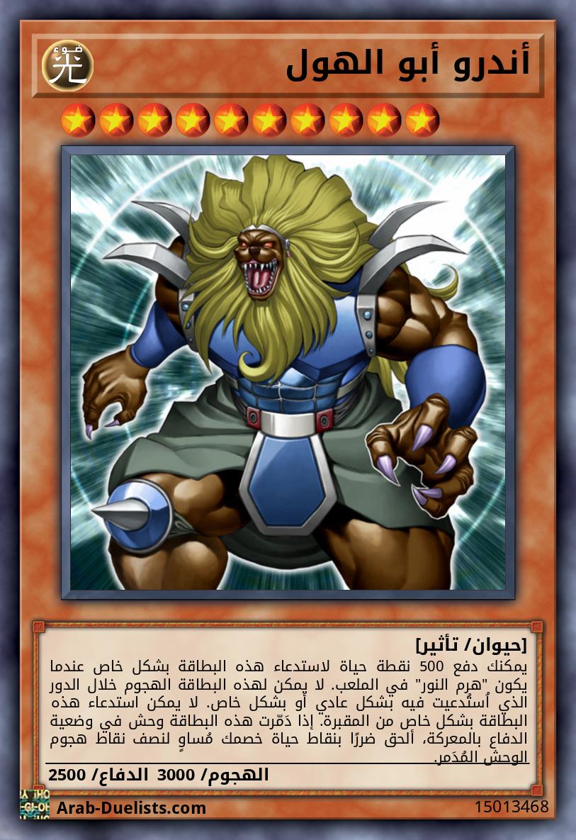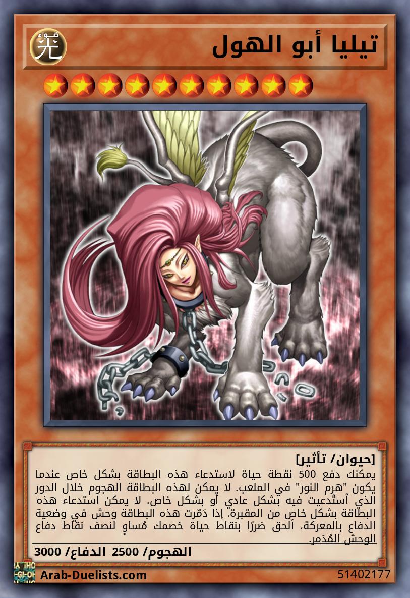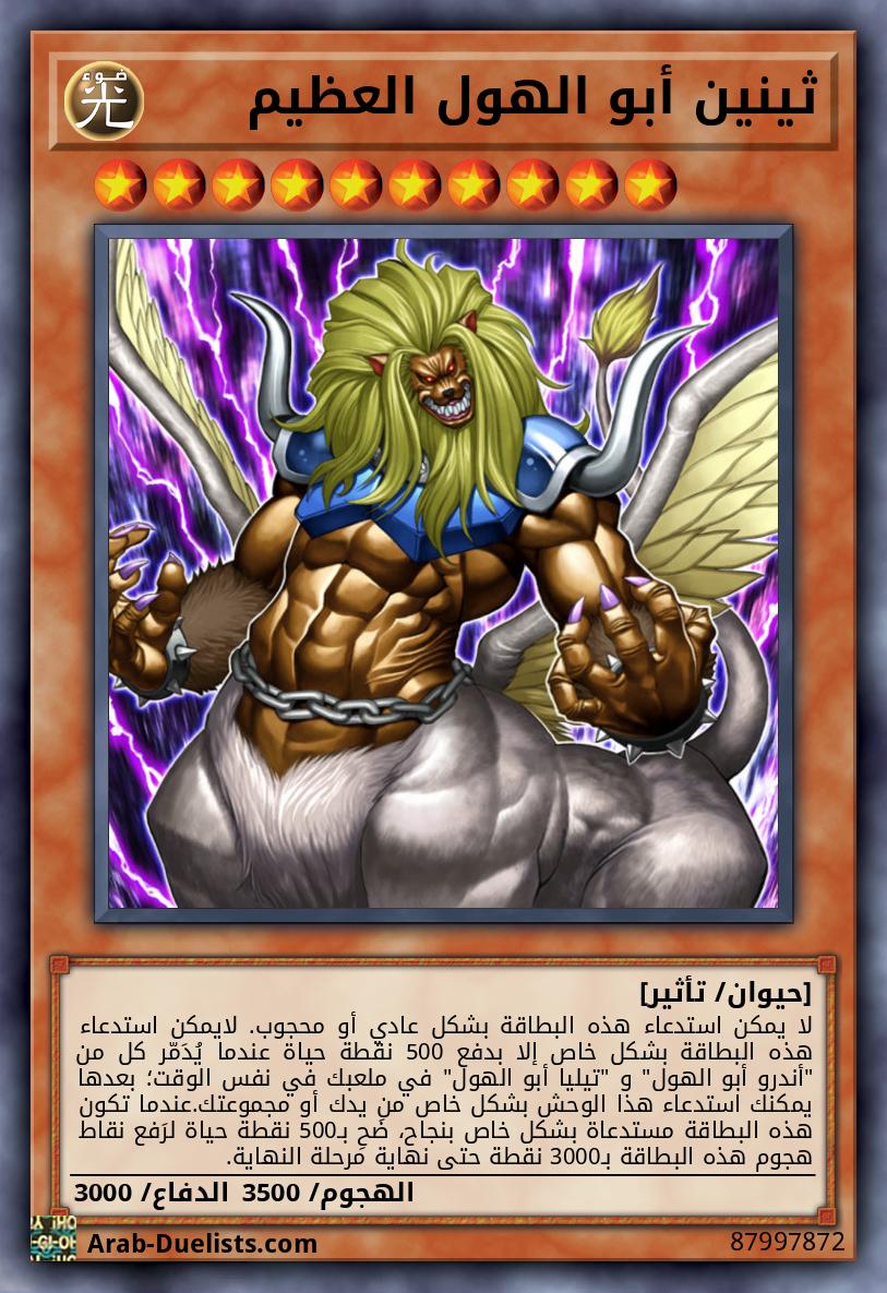 لا يمكن استدعاء هذه البطاقة بشكل عادي أو محجوب. لايمكن استدعاء هذه البطاقة بشكل خاص إلا بدفع 500 نقطة حياة عندما يُدَمّر كل من "أندرو أبو الهول" و "تيليا أبو الهول" في ملعبك في نفس الوقت؛ بعدها يمكنك استدعاء هذا الوحش بشكل خاص من يدك أو مجموعتك.عندما تكون هذه البطاقة مستدعاة بشكل خاص بنجاح، ضَحِ بـ500 نقطة حياة لرَفع نقاط هجوم هذه البطاقة بـ3000 نقطة حتى نهاية مرحلة النهاية.