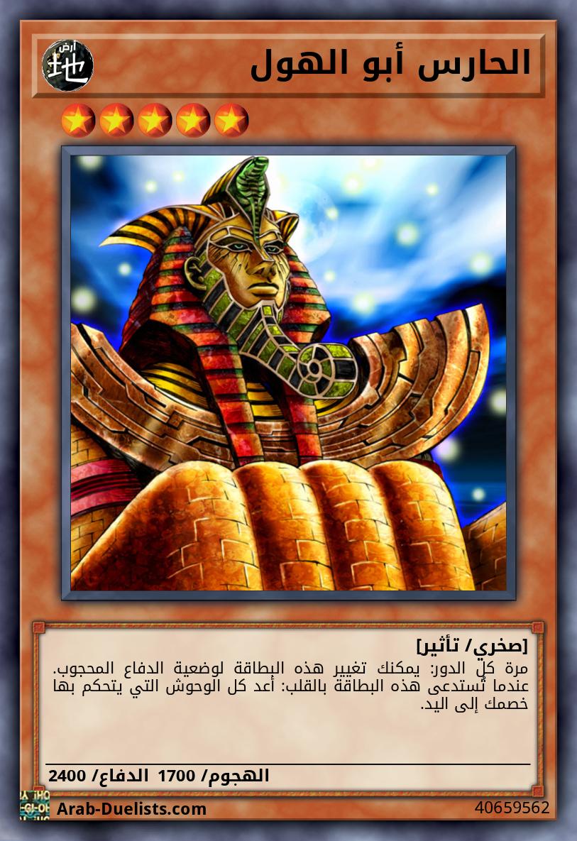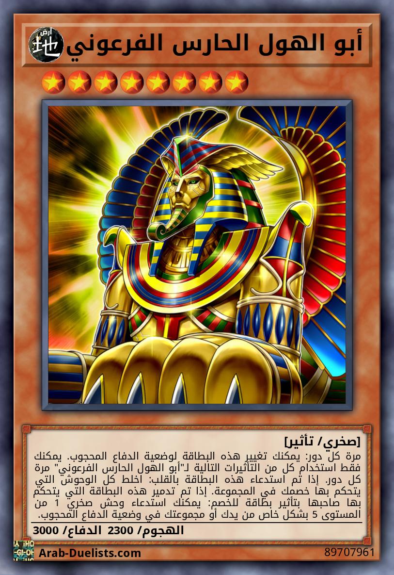 مرة كل دور: يمكنك تغيير هذه البطاقة لوضعية الدفاع المحجوب. يمكنك فقط استخدام كل من التأثيرات التالية لـ"أبو الهول الحارس الفرعوني" مرة كل دور. إذا تم استدعاء هذه البطاقة بالقلب: اخلط كل الوحوش التي يتحكم بها خصمك في المجموعة. إذا تم تدمير هذه البطاقة التي يتحكم بها صاحبها بتأثير بطاقة للخصم: يمكنك استدعاء وحش صخري 1 من المستوى 5 بشكل خاص من يدك أو مجموعتك في وضعية الدفاع المحجوب.