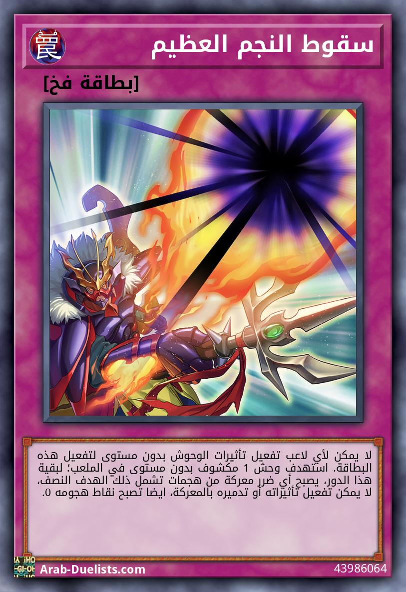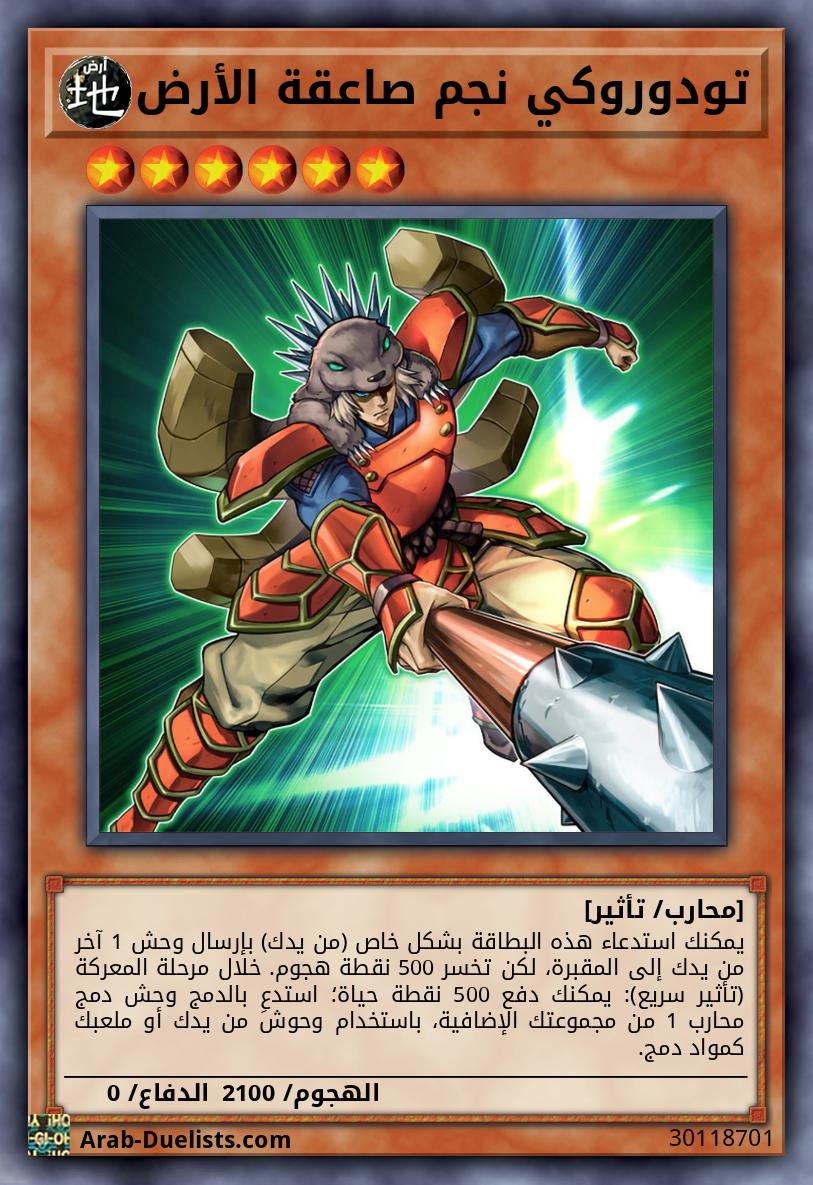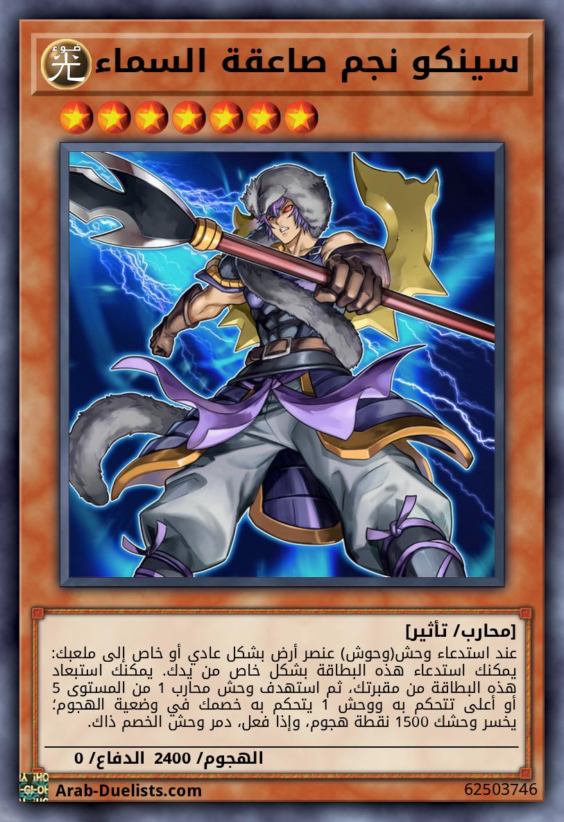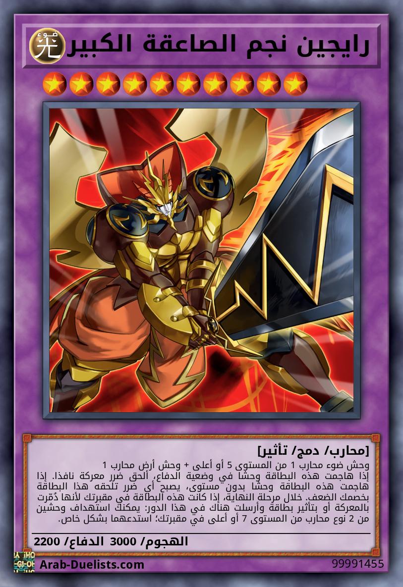 وحش ضوء محارب 1 من المستوى 5 أو أعلى + وحش أرض محارب 1 إذا هاجمت هذه البطاقة وحشا في وضعية الدفاع، ألحق ضرر معركة نافذا. إذا هاجمت هذه البطاقة وحشا بدون مستوى، يصبح أي ضرر تلحقه هذا البطاقة بخصمك الضعف. خلال مرحلة النهاية، إذا كانت هذه البطاقة في مقبرتك لأنها دُمّرت بالمعركة أو بتأثير بطاقة وأرسلت هناك في هذا الدور: يمكنك استهداف وحشين من 2 نوع محارب من المستوى 7 أو أعلى في مقبرتك؛ استدعهما بشكل خاص.