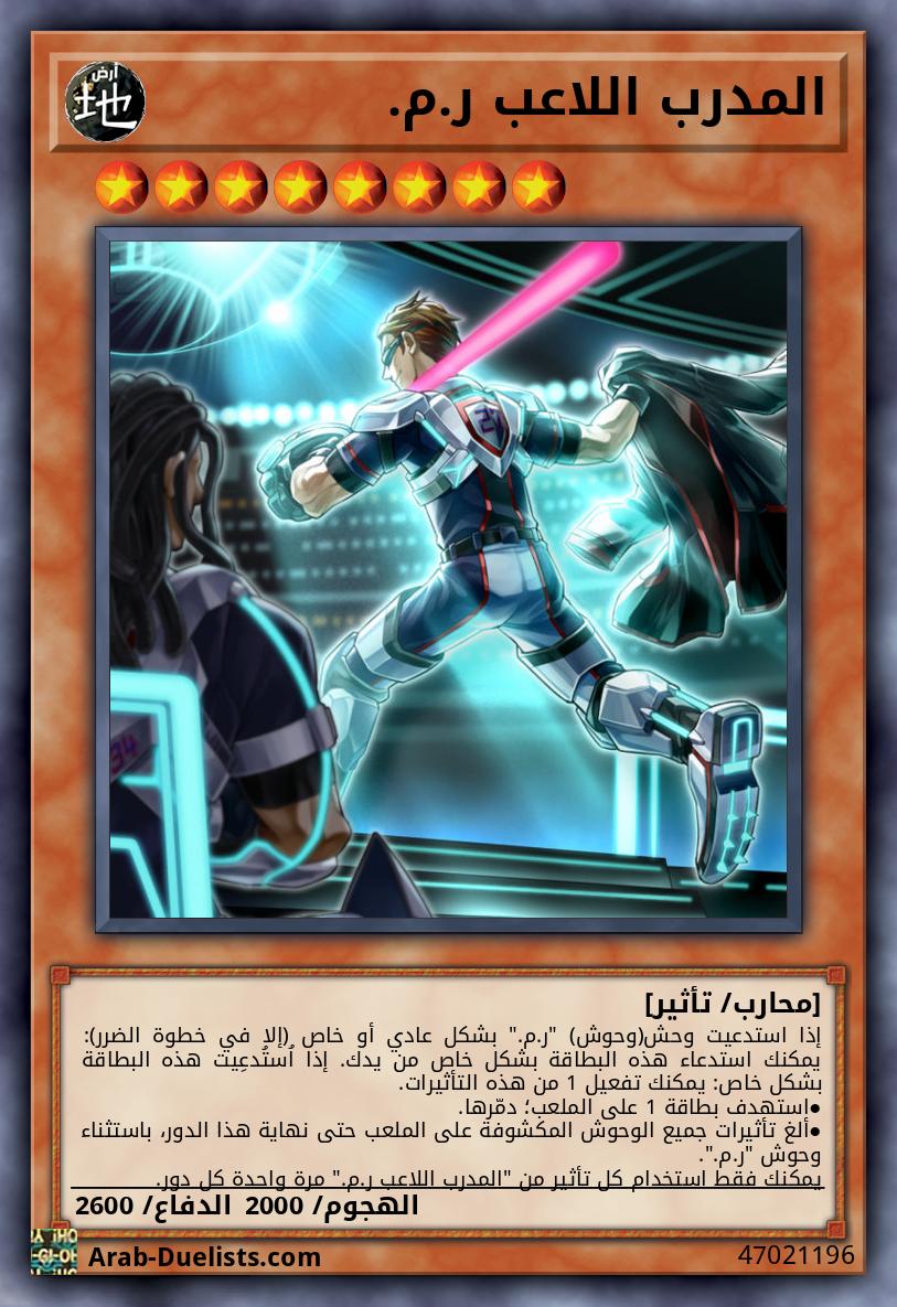 إذا استدعيت وحش(وحوش) "ر.م." بشكل عادي أو خاص (إلا في خطوة الضرر): يمكنك استدعاء هذه البطاقة بشكل خاص من يدك. إذا اُستُدعِيت هذه البطاقة بشكل خاص: يمكنك تفعيل 1 من هذه التأثيرات. ●استهدف بطاقة 1 على الملعب؛ دمّرها. ●ألغ تأثيرات جميع الوحوش المكشوفة على الملعب حتى نهاية هذا الدور، باستثناء وحوش "ر.م.". يمكنك فقط استخدام كل تأثير من "المدرب اللاعب ر.م." مرة واحدة كل دور.