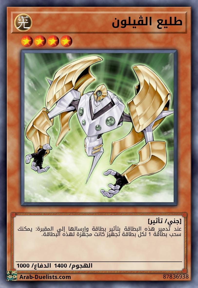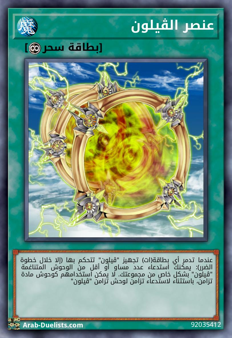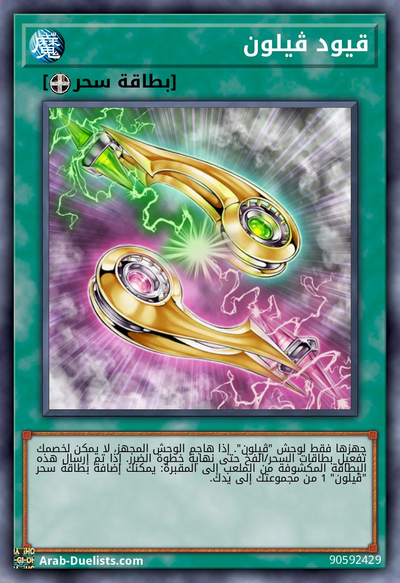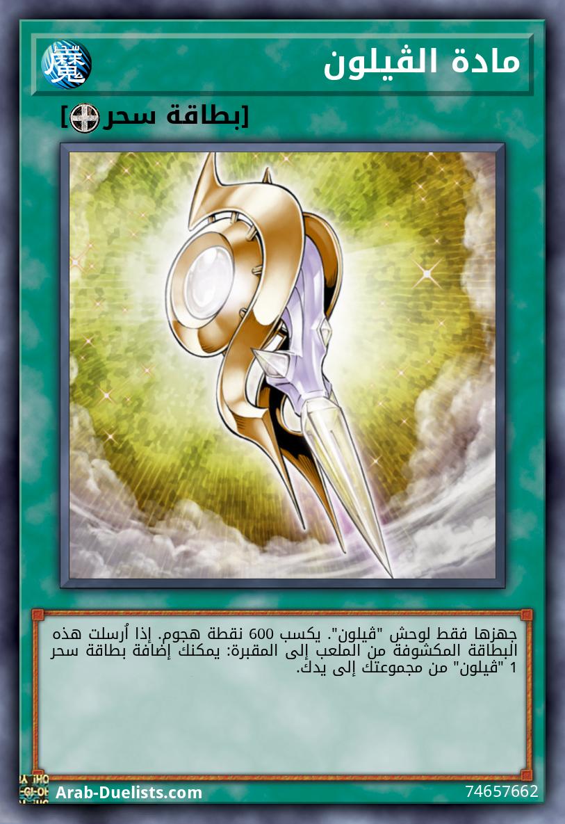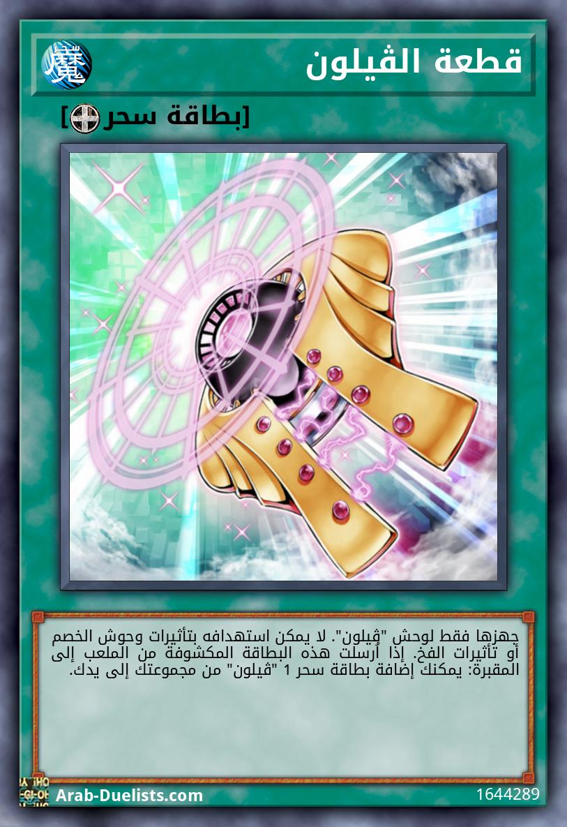 جهزها فقط لوحش "ڤيلون". لا يمكن استهدافه بتأثيرات وحوش الخصم أو تأثيرات الفخ. إذا اُرسلت هذه البطاقة المكشوفة من الملعب إلى المقبرة: يمكنك إضافة بطاقة سحر 1 "ڤيلون" من مجموعتك إلى يدك.