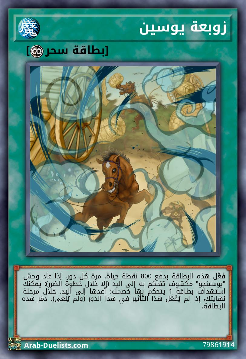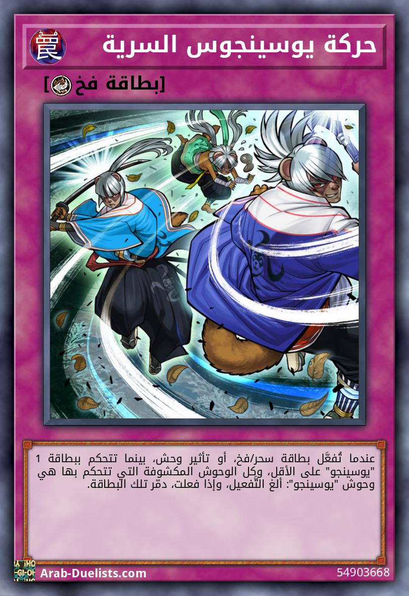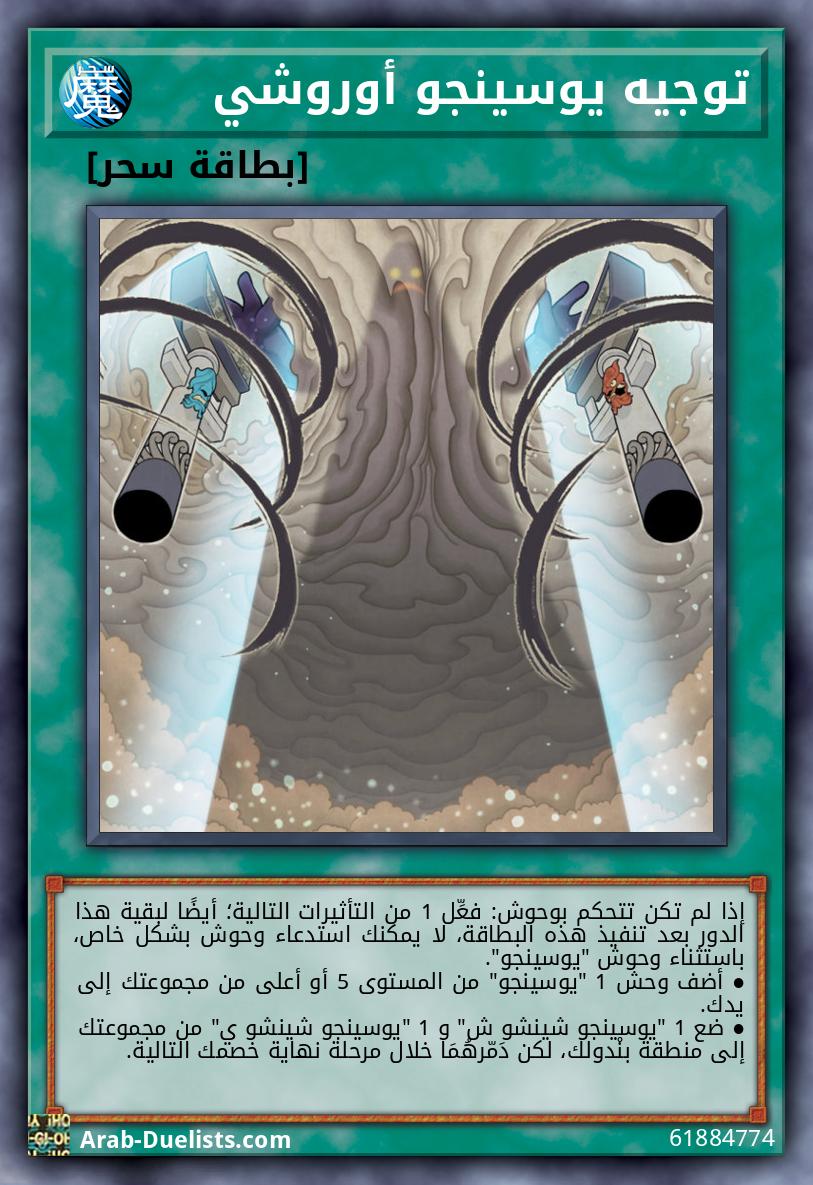 عندما تُفعَّل بطاقة سحر/فخ، أو تأثير وحش، بينما تتحكم ببطاقة 1 "يوسينجو" على الأقل، وكل الوحوش المكشوفة التي تتحكم بها هي وحوش "يوسينجو": ألغ التَّفعيل، وإذا فعلت، دمّر تلك البطاقة.