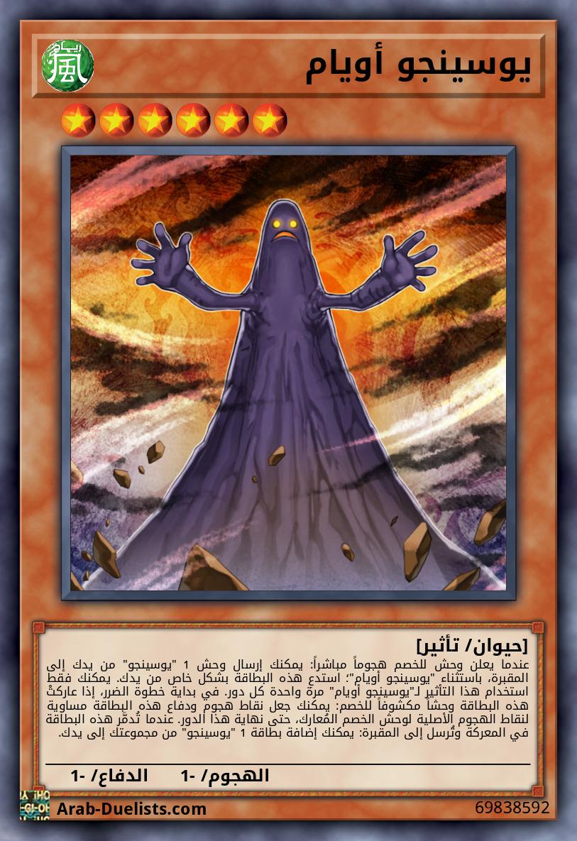عندما يعلن وحش للخصم هجوماً مباشراً: يمكنك إرسال وحش 1 "يوسينجو" من يدك إلى المقبرة، باستثناء "يوسينجو أويام"؛ استدعِ هذه البطاقة بشكل خاص من يدك. يمكنك فقط استخدام هذا التأثير لـ"يوسينجو أويام" مرة واحدة كل دور. في بداية خطوة الضرر، إذا عاركتْ هذه البطاقة وحشاً مكشوفاً للخصم: يمكنك جعل نقاط هجوم ودفاع هذه البطاقة مساوية لنقاط الهجوم الأصلية لوحش الخصم المُعارك، حتى نهاية هذا الدور. عندما تُدمَّر هذه البطاقة في المعركة وتُرسل إلى المقبرة: يمكنك إضافة بطاقة 1 "يوسينجو" من مجموعتك إلى يدك.
