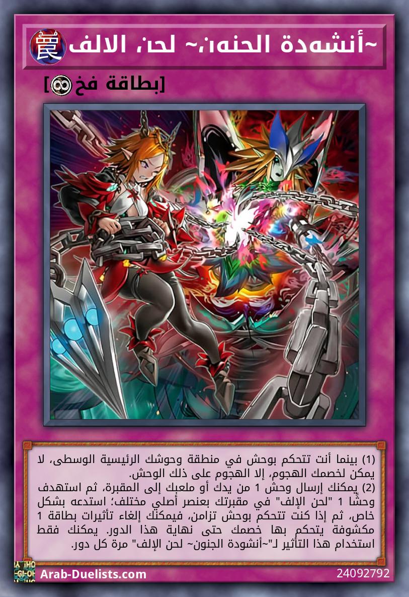 (1) بينما أنت تتحكم بوحش في منطقة وحوشك الرئيسية الوسطى، لا يمكن لخصمك الهجوم، إلا الهجوم على ذلك الوحش. (2) يمكنك إرسال وحش 1 من يدك أو ملعبك إلى المقبرة، ثم استهدف وحشًا 1 "لحن الإلف" في مقبرتك بعنصر أصلي مختلف؛ استدعه بشكل خاص، ثم إذا كنت تتحكم بوحش تزامن، فيمكنك إلغاء تأثيرات بطاقة 1 مكشوفة يتحكم بها خصمك حتى نهاية هذا الدور. يمكنك فقط استخدام هذا التأثير لـ"~أنشودة الجنون~ لحن الإلف" مرة كل دور.