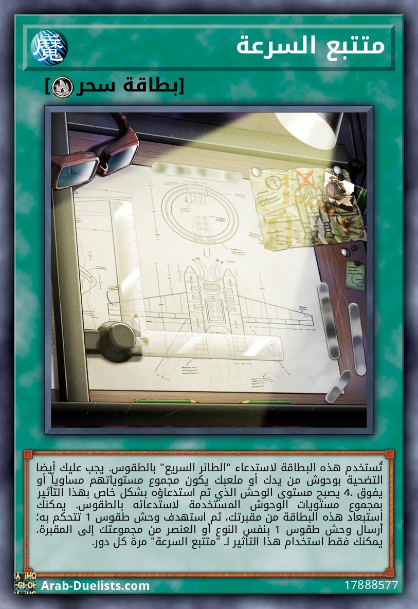 تُستخدم هذه البطاقة لاستدعاء "الطائر السريع" بالطقوس. يجب عليك أيضا التضحية بوحوش من يدك أو ملعبك يكون مجموع مستوياتهم مساوياً أو يفوق 4. يصبح مستوى الوحش الذي تم استدعاؤه بشكل خاص بهذا التأثير بمجموع مستويات الوحوش المستخدمة لاستدعائه بالطقوس. يمكنك استبعاد هذه البطاقة من مقبرتك، ثم استهدف وحش طقوس 1 تتحكم به؛ أرسال وحش طقوس 1 بنفس النوع أو العنصر من مجموعتك إلى المقبرة. يمكنك فقط استخدام هذا التأثير لـ "متتبع السرعة" مرة كل دور. |