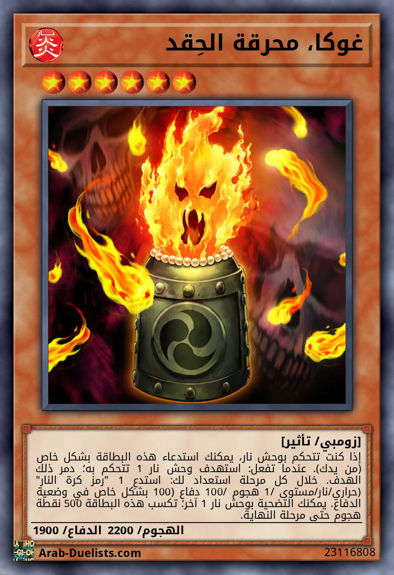 إذا كنت تتحكم بوحش نار، يمكنك استدعاء هذه البطاقة بشكل خاص (من يدك). عندما تفعل: استهدف وحش نار 1 تتحكم به؛ دمر ذلك الهدف. خلال كل مرحلة استعداد لك: استدعِ 1 "رمز كرة النار" (حراري/نار/مستوى 1/ هجوم 100/ دفاع 100) بشكل خاص في وضعية الدفاع. يمكنك التضحية بوحش نار 1 آخر؛ تكسب هذه البطاقة 500 نقطة هجوم حتى مرحلة النهاية. |