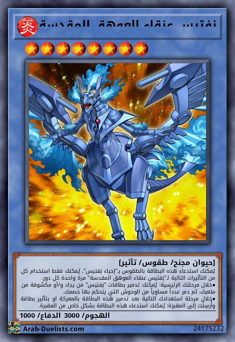 يُمكنك استدعاء هذه البطاقة بالطقوس بـ "إحياء نِفتيس". يُمكنك فقط استخدام كل من التأثيرات التالية لـ "نِفتيس عنقاء العوهق المقدسة" مرة واحدة كل دور. |
