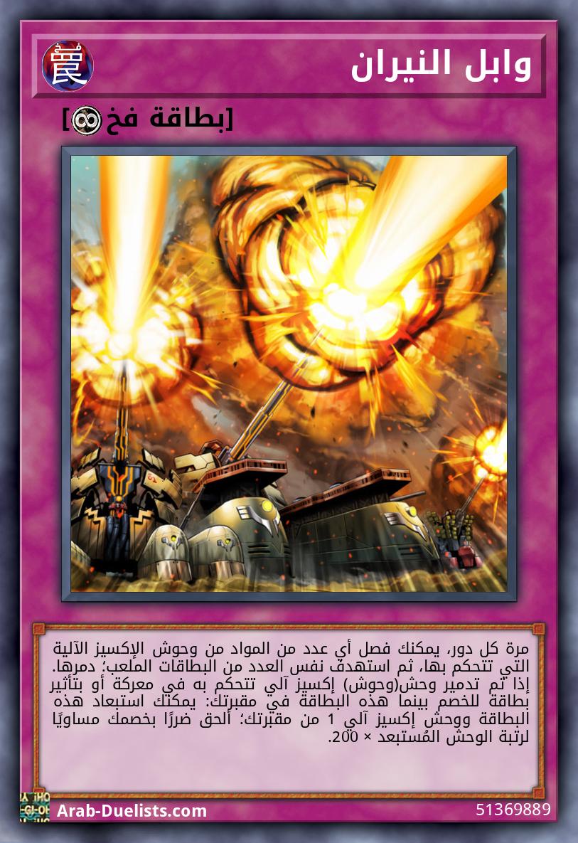 مرة كل دور، يمكنك فصل أي عدد من المواد من وحوش الإكسيز الآلية التي تتحكم بها، ثم استهدف نفس العدد من البطاقات الملعب؛ دمرها. إذا تم تدمير وحش(وحوش) إكسيز آلي تتحكم به في معركة أو بتأثير بطاقة للخصم بينما هذه البطاقة في مقبرتك: يمكنك استبعاد هذه البطاقة ووحش إكسيز آلي 1 من مقبرتك؛ ألحق ضررًا بخصمك مساويًا لرتبة الوحش المُستبعد × 200. |