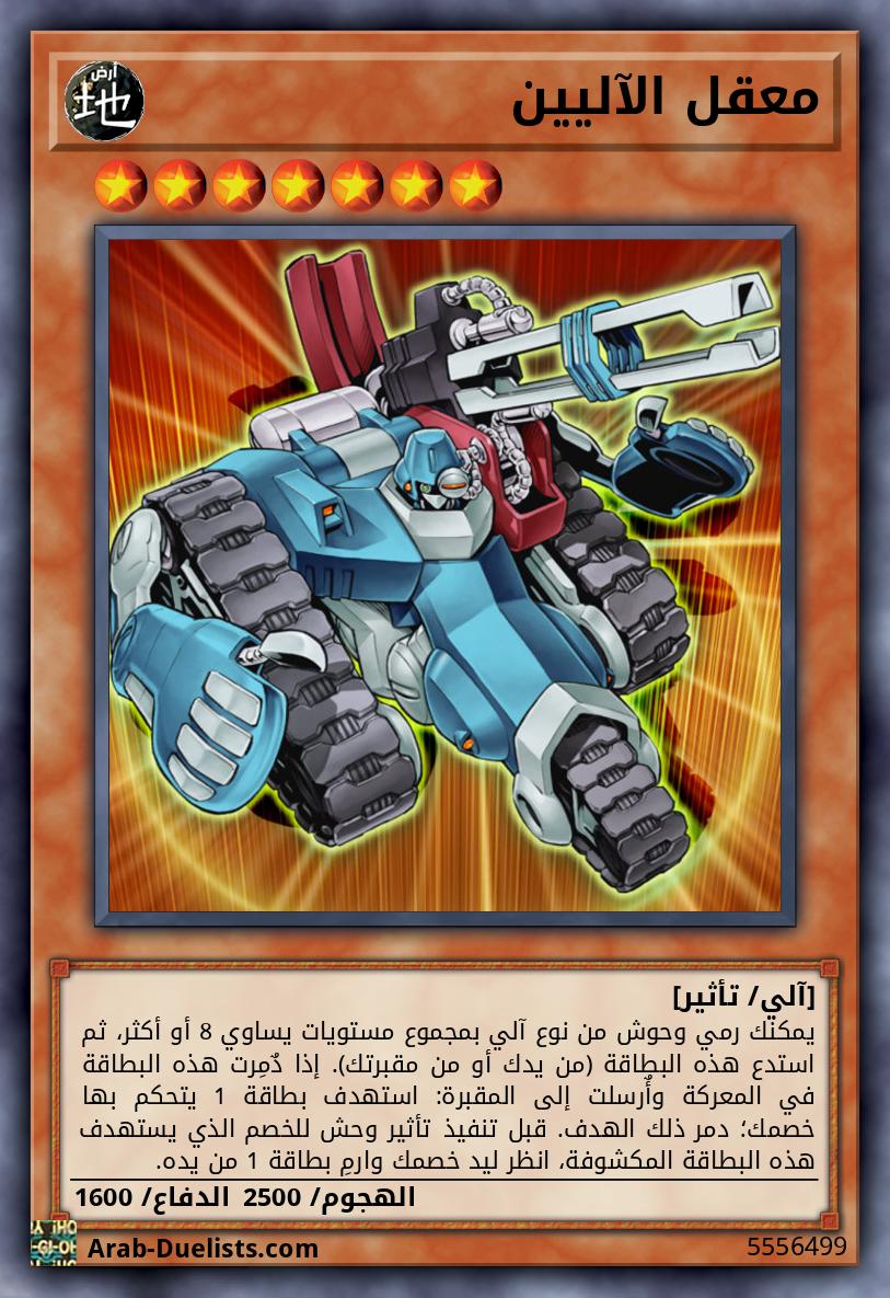 يمكنك رمي وحوش من نوع آلي بمجموع مستويات يساوي 8 أو أكثر، ثم استدع هذه البطاقة (من يدك أو من مقبرتك). إذا دٌمِرت هذه البطاقة في المعركة وأٌرسلت إلى المقبرة: استهدف بطاقة 1 يتحكم بها خصمك؛ دمر ذلك الهدف. قبل تنفيذ تأثير وحش للخصم الذي يستهدف هذه البطاقة المكشوفة، انظر ليد خصمك وارمِ بطاقة 1 من يده. |