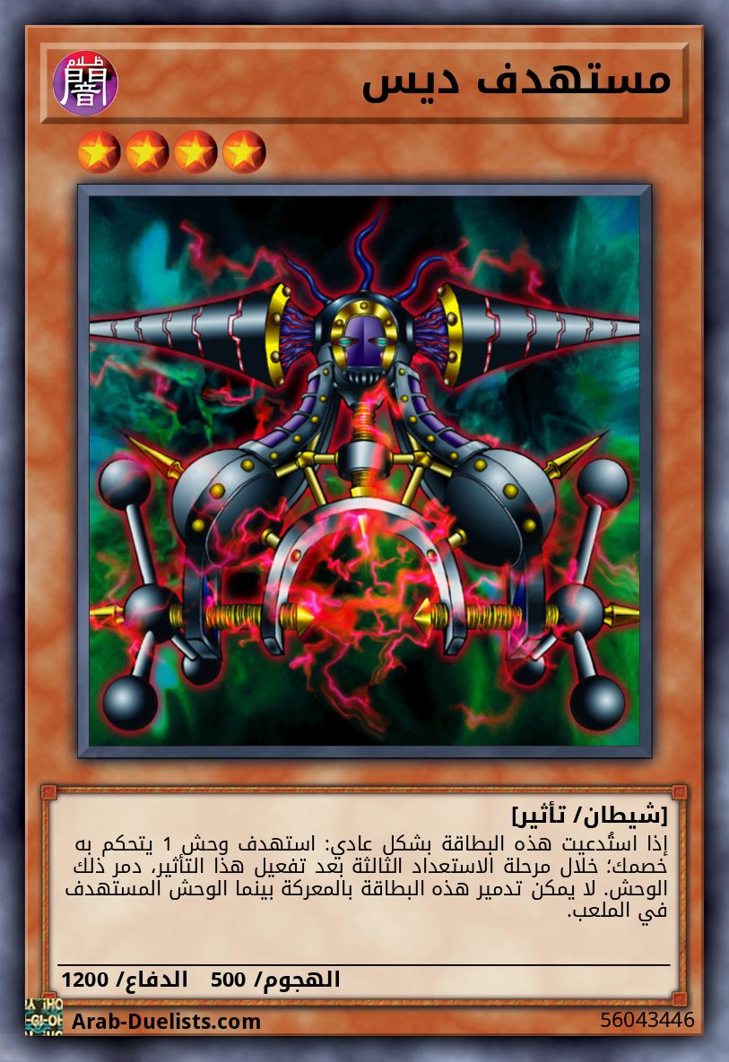 إذا استُدعيت هذه البطاقة بشكل عادي: استهدف وحش 1 يتحكم به خصمك؛ خلال مرحلة الاستعداد الثالثة بعد تفعيل هذا التأثير، دمر ذلك الوحش. لا يمكن تدمير هذه البطاقة بالمعركة بينما الوحش المستهدف في الملعب. |