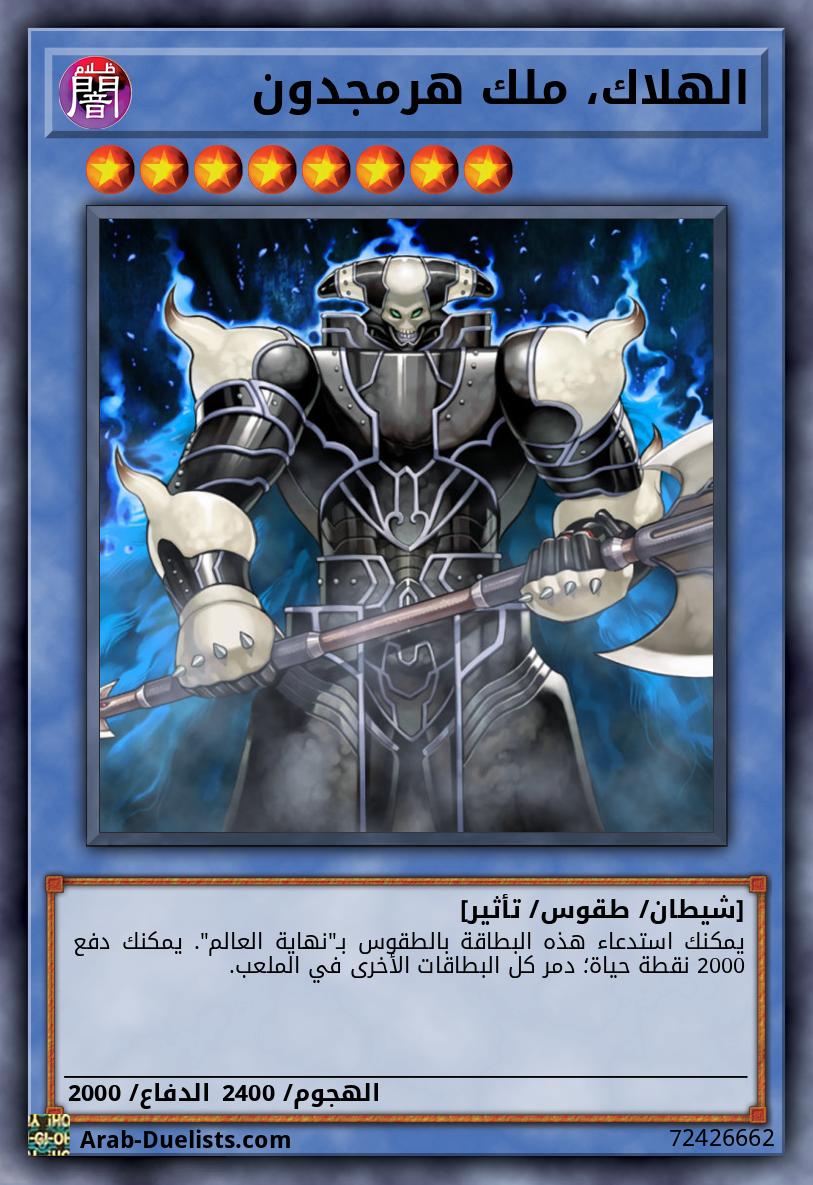 يمكنك استدعاء هذه البطاقة بالطقوس بـ "نهاية العالم". يمكنك دفع 2000 نقطة حياة؛ دمر كل البطاقات الأخرى في الملعب. |